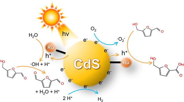 熊宇杰教授研究团队通过在 CdS 量子点上锚定 Ru 配合物,开发了一种高效的光催化剂。基于在不同的气氛下可控生成的两个氧自由基,实现了 HMF 向 DFF 或 HMFCA 的选择性氧化,并且具有高转化率(>81%)和选择性(>90%)。这种选择性光催化转换也可以在实验室外通过自然阳光正常驱动。该工作首次实现了通过太阳光驱动HMF选择氧化生产HMFCA。更重要的是,该光催化剂已被证明适用于其他具有羟基和醛基化合物的选择氧化。