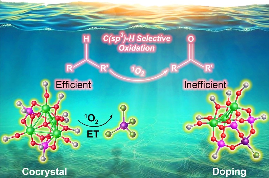基于此,该团队巧妙地设计合成了一种晶态的、含三价铁(FeⅢ)的共晶型钛氧簇合物Ti4Fe1。该团簇化合物能够很好地调控光激发状态下的能量转移和电荷转移过程,使得光生空穴和单线态氧协同作用活化C(sp3)-H键,从而实现了将烃类碳氢化合物(C5至C16)高效和选择性地氧化成醛和酮,转化率高达12,860 μmol·g−1·h−1,比FeⅢ掺杂型的钛氧簇合物Ti3Fe1高出5.7倍。该工作为从原子水平上调控光催化剂的电子结构和能量转移提供了新的见解,为光催化氧化反应中提高光生载流子和活性物种转化效率提供了理论指导。