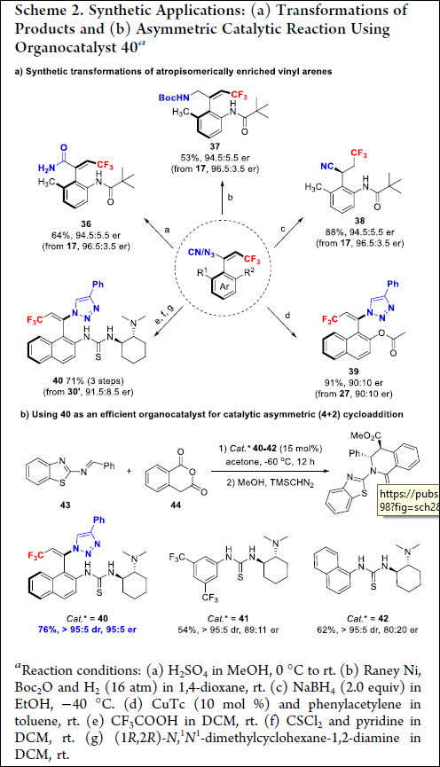 付亮教授与中国科学院上海有机化学研究所刘国生研究员合作,成功实现了烯基自由基的不对称氰基化和叠氮化反应用以高效构建轴手性烯基芳烃,并对氰基化反应的机理进行了深入研究。在此基础上他们对轴手性氰基化和叠氮化产物进行了一系列转化,例如氰基可以转化成酰胺和胺甲基官能团,尤其是通过对轴手性叠氮化产物的后续转化,该方法学还被应用于含有轴手性的硫脲三级胺催化剂合成,用以高效催化高酞酸酐与亚胺的非对映选择性和对映选择性的(4+2)环化反应。