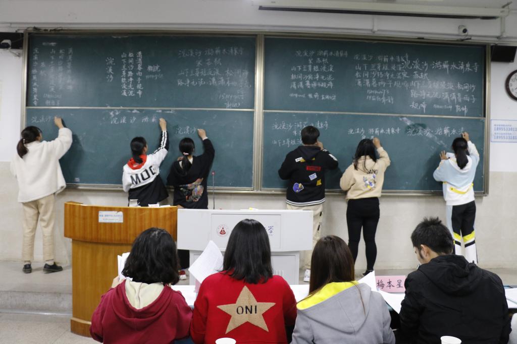 比赛分为粉笔板书、硬笔书法和毛笔书写三项,要求选手在规定时间内完成文字的书写,各项比赛同时分区域进行。参赛者按照预先确定的顺序进行比赛,在他们的笔尖下,毛笔字一撇一捺苍劲有力,硬笔字一笔一划笔走龙蛇,粉笔板书一横一竖规范整齐。场上的选手们将诗意融入书法之中,在笔墨中沉淀升华人生。他们尽情展现书法功底,或潇洒飘逸,或力透纸背,或方圆兼备,短短的时间内便涌现一批批笔画流畅,横平竖直,结构匀称的佳作。