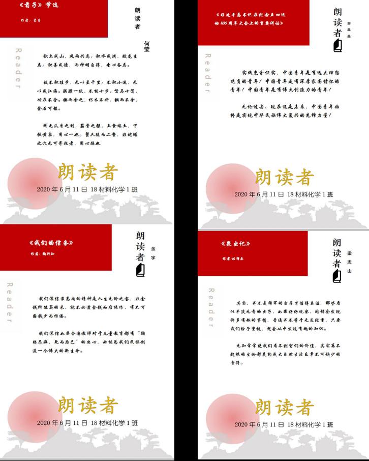 本网讯 (18材料化学 黄宁宁)览历史之壮阔,诵英烈之丹心,咏至亲之大爱,展青春之风采。为缓解疫情期间可能给同学们带来的心理压力,丰富班集体精神文明建设,18材料化学1班参考中央电视台推出的《朗读者》节目,特举办同名系列活动。活动目的在于分享同学们居家期间阅读的好书好文,将自己最喜欢的诗歌、短文、故事,用声情并茂的朗读方式给全班师生们分享。