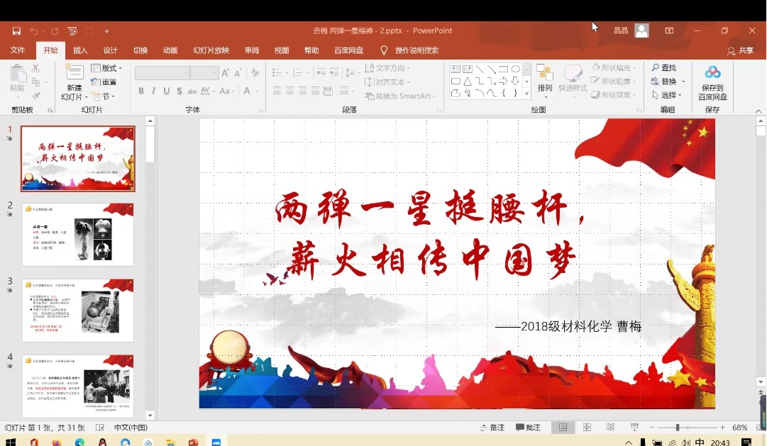 学院党史宣讲团成员曹梅同学为支部全体同学带来了一场生动的党史宣讲,通过视频学校、互动提问等方式向大家介绍了两弹一星制造过程中的艰难险阻。