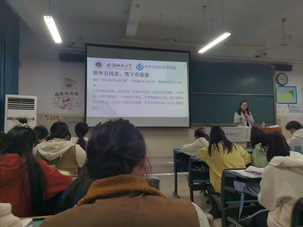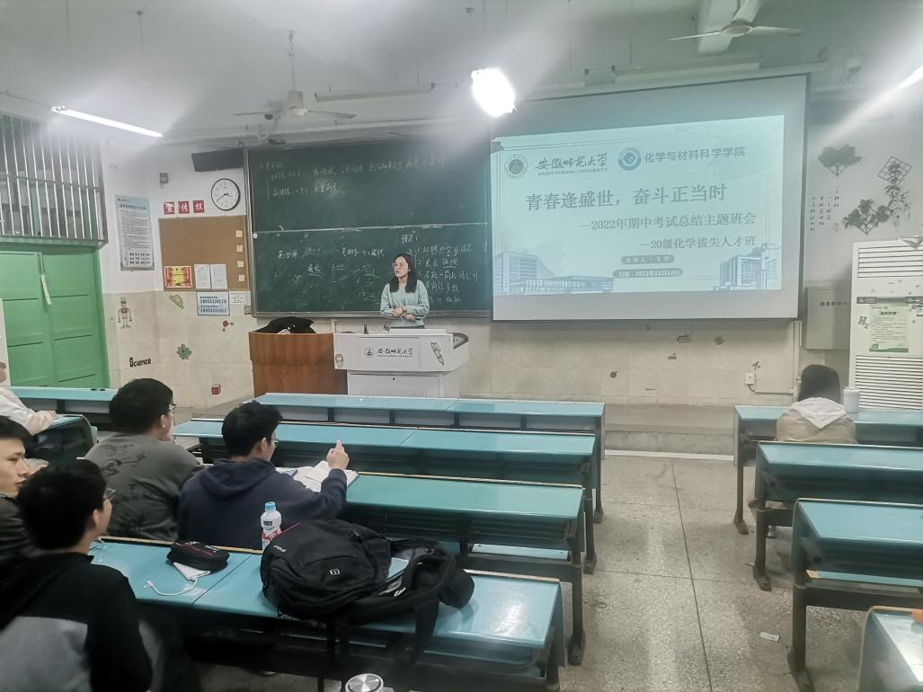 的学科振兴和基础教育振兴“两大振兴行动计划”,辅导员王芳老师在2022年11月15日、17日及18日先后于行政楼2070201、2010502和2010303教室,相继为2020级化学师范、应用化学和化学拔尖人才班召开了“越努力越幸运”、“青春逢盛世,青春正当时”为主题的学风建设暨期中考试分析总结班会。