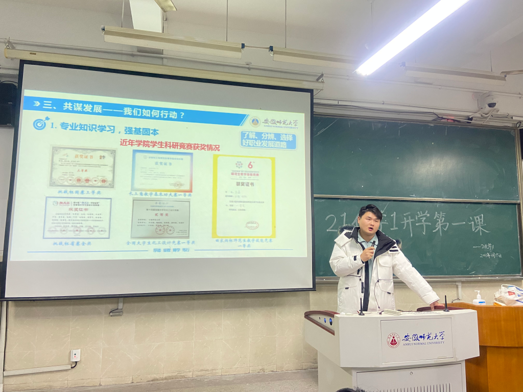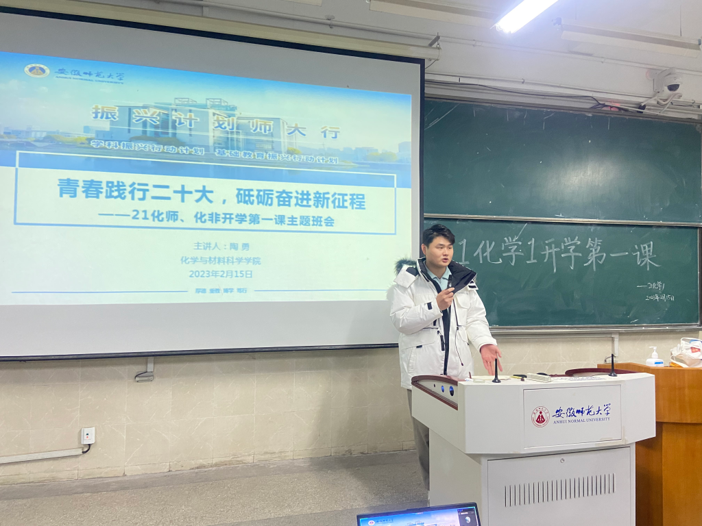 陈淑婷、陶勇)为深入学习贯彻党的二十大精神,引领同学们听党话、跟党走,懂得党的关怀和期望,同时指导同学们做好新学期各项准备工作,用稳定的情绪、努力的态度、积极向上的乐观心态迎接新学期,踏上新征程,2月15日、18日,辅导员陶勇老师分别在2010504、2070205教室为2021级化学师范、化学非师范专业全体同学召开本学期“开学第一课”主题班会。本次班会以“青春践行二十大,砥砺奋进新征程”为主题,围绕党的二十大精神宣讲、德育教育、疫情防控、学风建设、校园安全教育等内容开展。