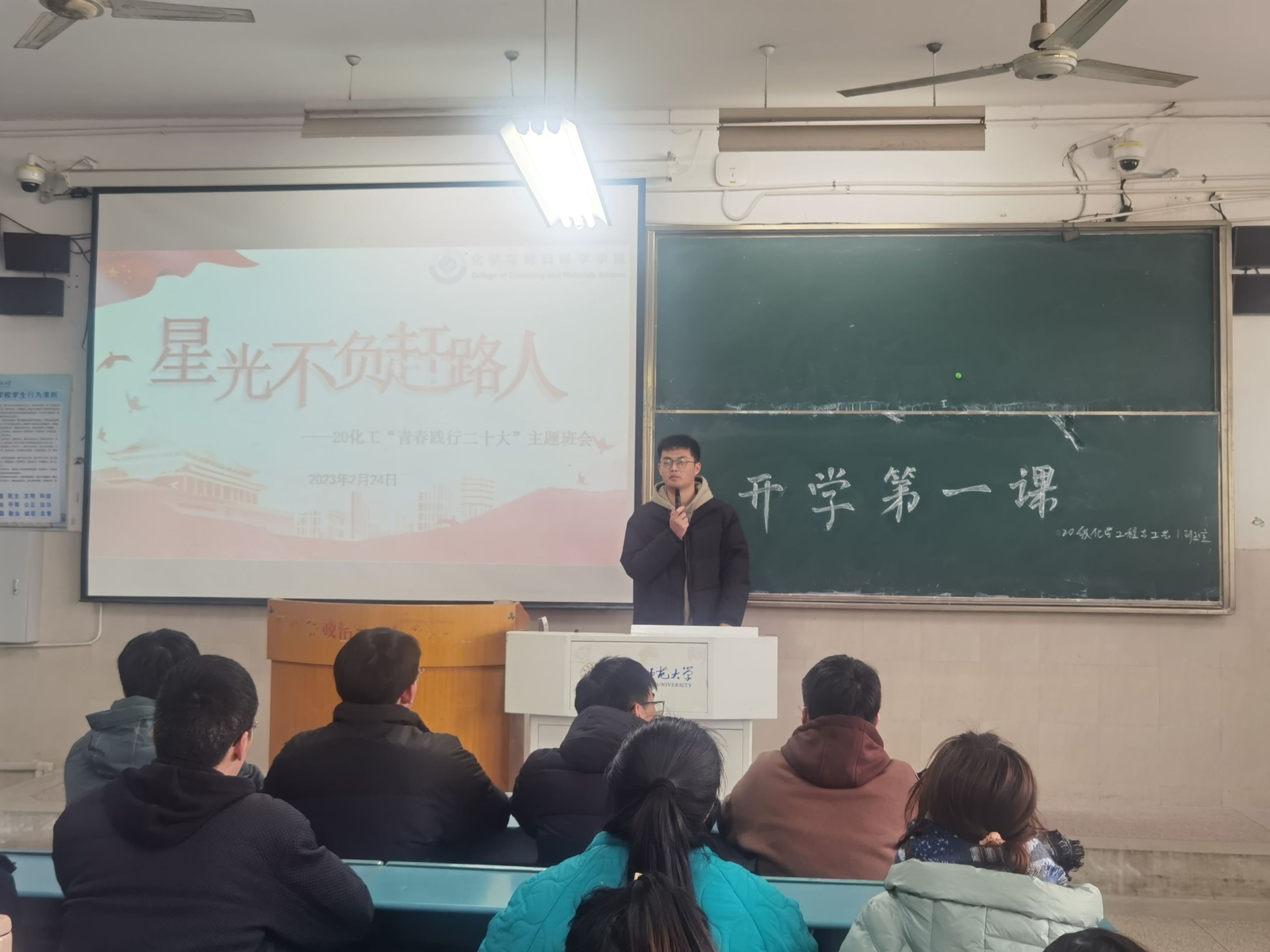 汪芙琳)为深入学习贯彻党的二十大精神,以更饱满的精神迎接新学期的到来,2月24日,辅导员于洪翔在行知楼2020503教室为2020级化学工程与工艺专业全体同学召开“青春践行二十大,星光不负赶路人”的主题班会,围绕党的二十大精神宣讲、学风建设、安全教育、考研就业等内容开展。