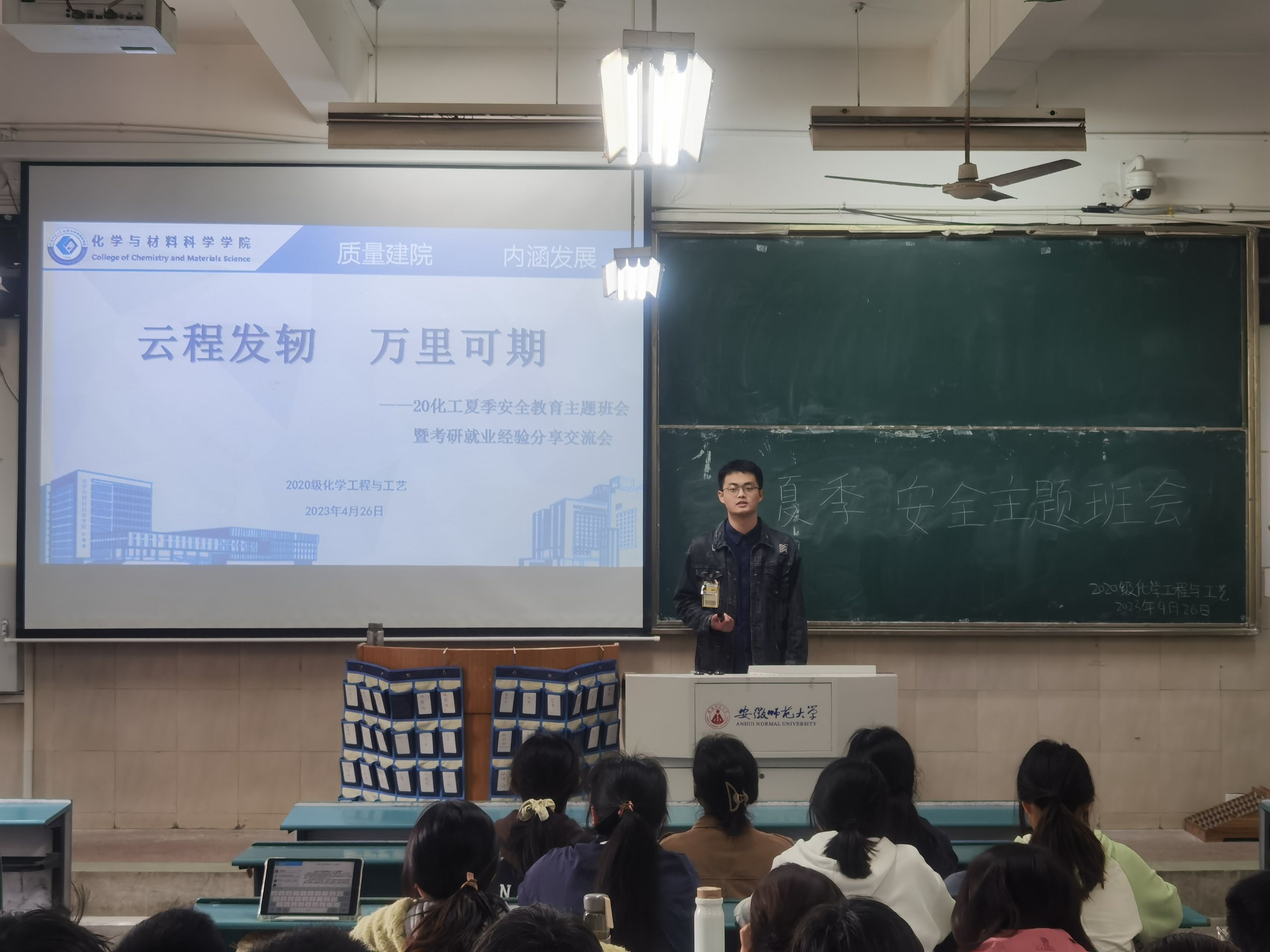 汪芙琳)为提升同学们的夏季校园安全防范意识,深入了解当前考研与就业的形势,以稳定的情绪、努力的态度、积极向上的乐观心态迎接即将到来的大四毕业季。4月26日,辅导员于洪翔在2020104教室为2020级化学工程与工艺专业全体同学召开主题班会。本次班会围绕夏季校园安全与考研就业经验分享与交流等内容开展。在夏季校园安全主题班会中,辅导员于洪翔就即将到来的五一假期的离校问题作出提醒,并强调夏季期间同学们要谨记遵守校规校纪,严禁在宿舍使用大功率电器等行为;“要钱不给,给钱不要”,谨防电信诈骗;日常注意饮食卫生安全等方面。