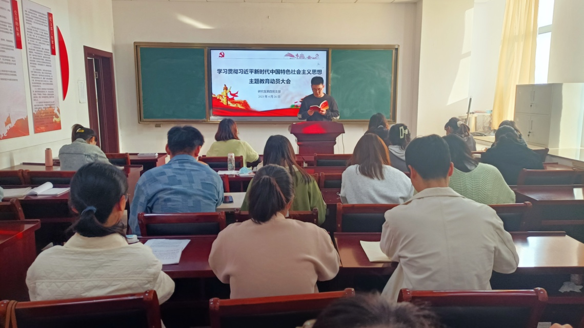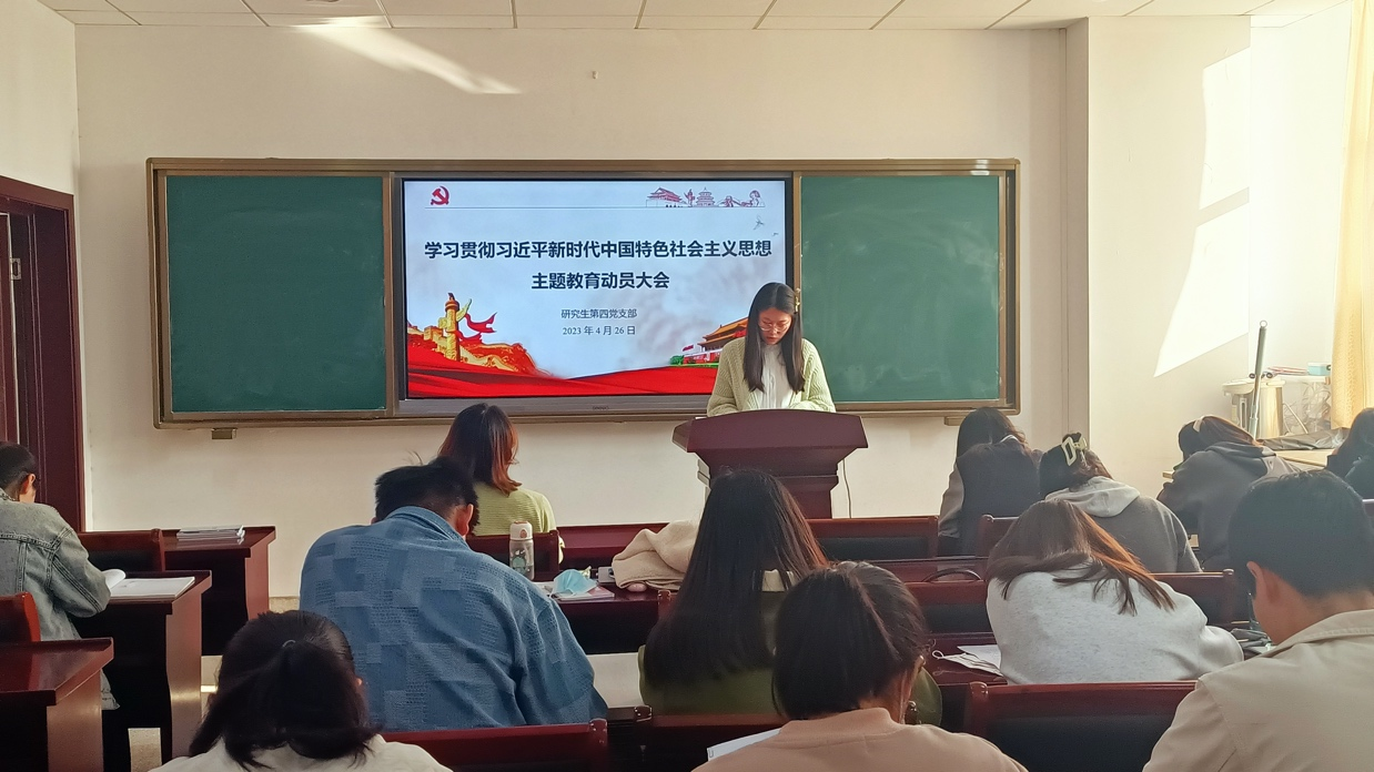 马皖珍)4月26日下午,研究生第四党支部在礼勤楼628会议室召开学习贯彻习近平新时代中国特色社会主义思想主题教育动员大会,学习传达有关工作会议精神和学校学院实施方案,对支部主题教育工作进行动员部署,支部指导老师张薇、支部全体学生党员参会。