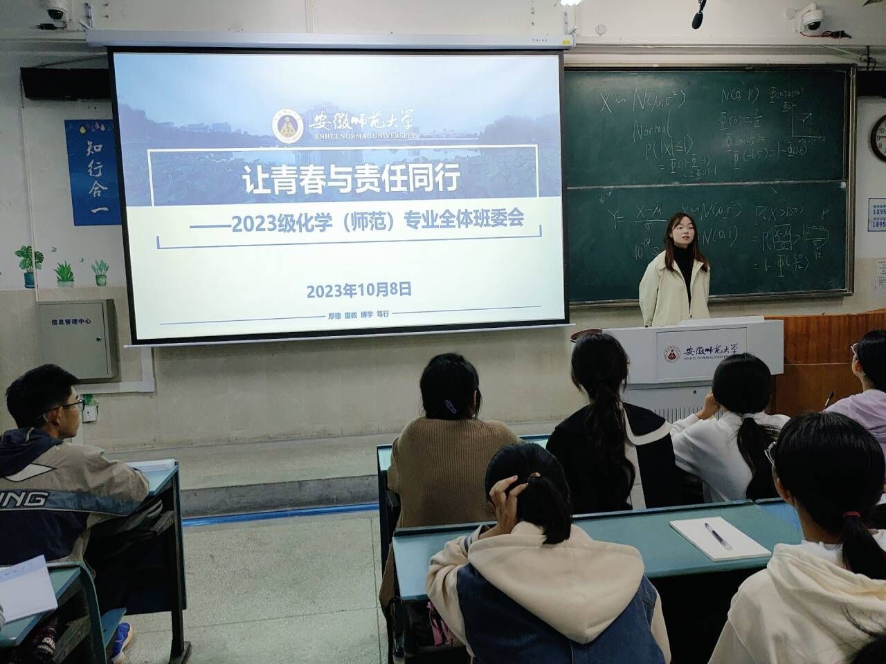 郭雨涵 王霞)秋风送爽,金桂飘香。为更好的开展班级建设工作,23级化学(师范)专业于10月8日18:00在行知楼1号楼205室开展了23级化师专业班委第一次例会。辅导员王霞老师出席并主持本次会议,本专业全体班委参加会议。