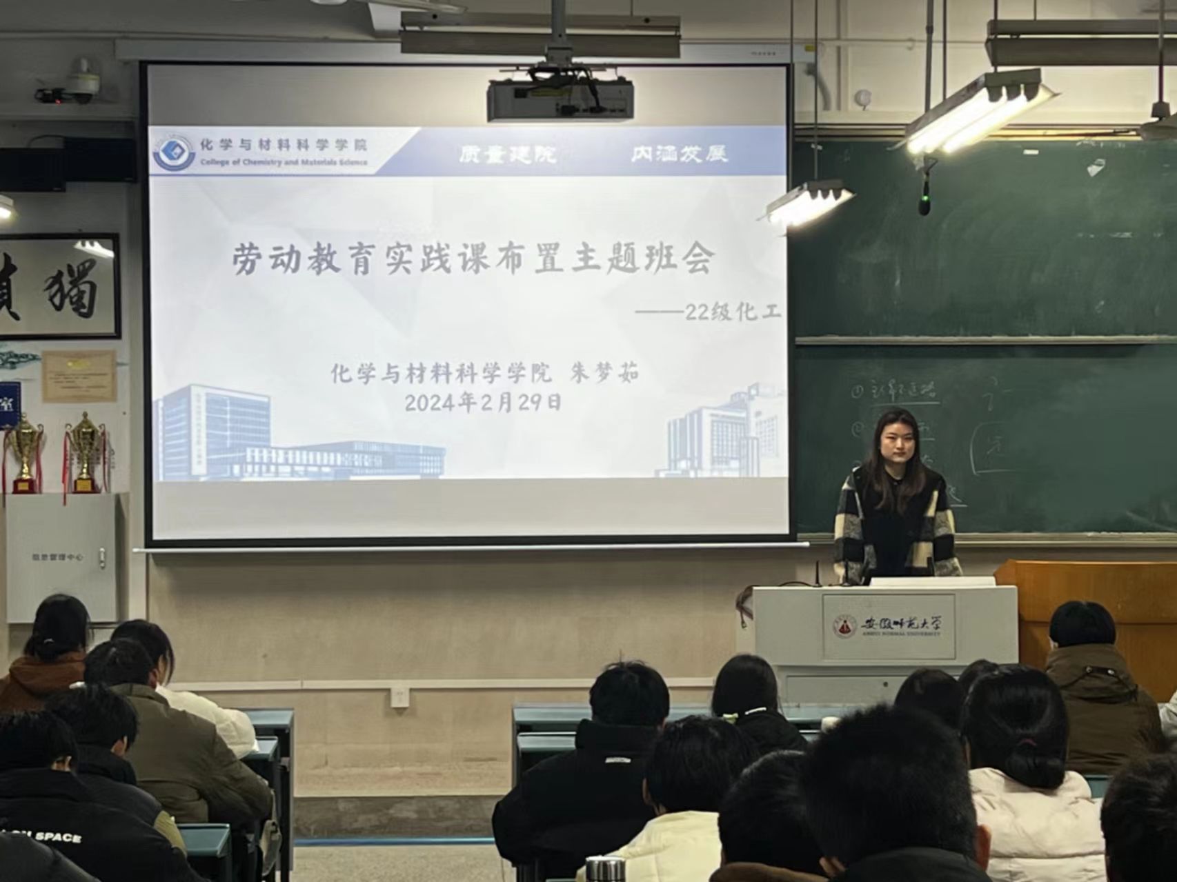 汤雷 朱梦茹)2024年2月29日晚,化学工程与工艺专业在2号楼302开展了劳动教育实践课布置主题班会。本次主题班会由辅导员朱梦茹主持,对此次劳动教育实践课的背景,意义以及安全问题进行了全面的讲解。