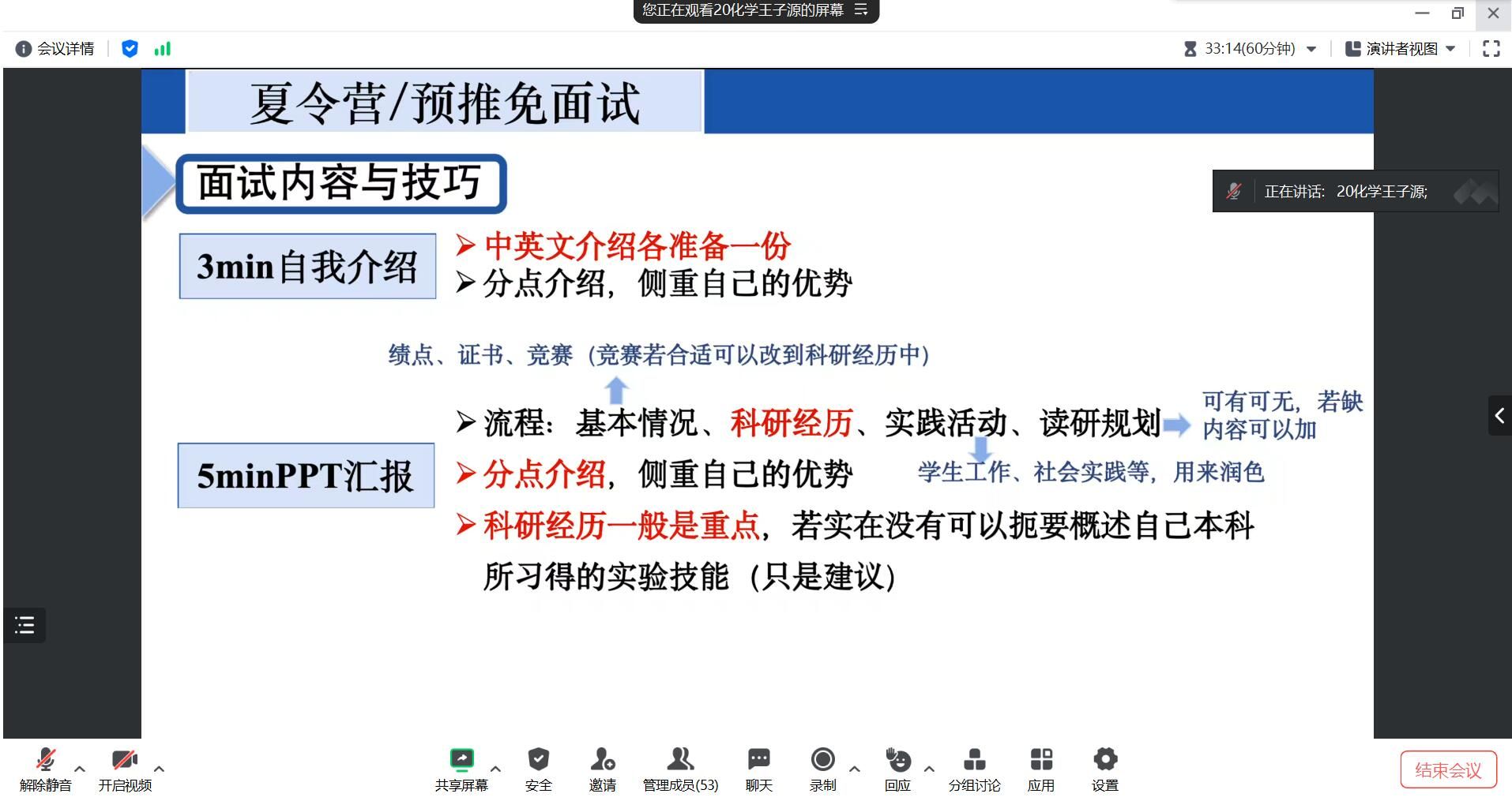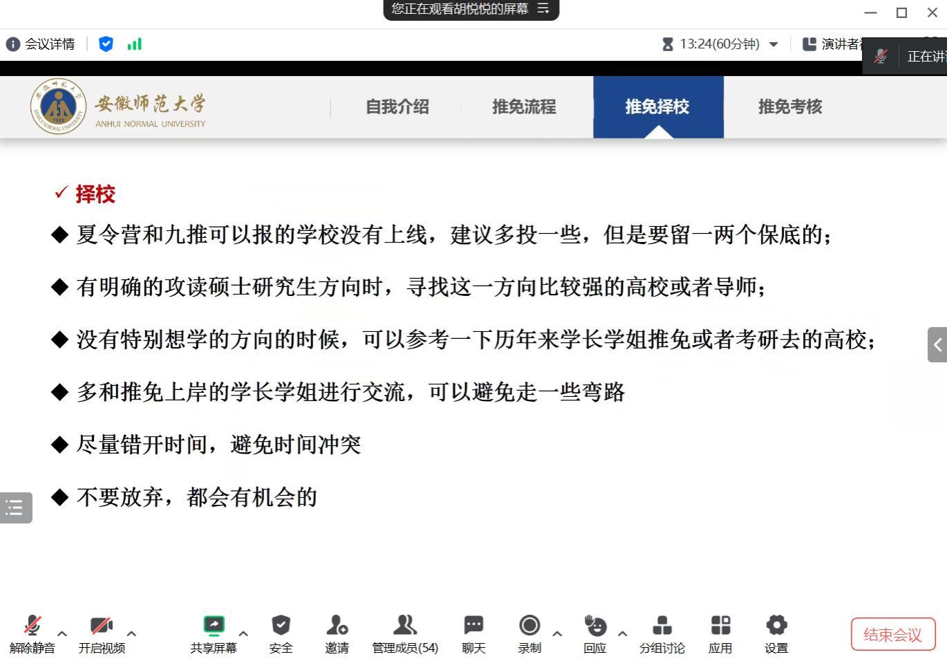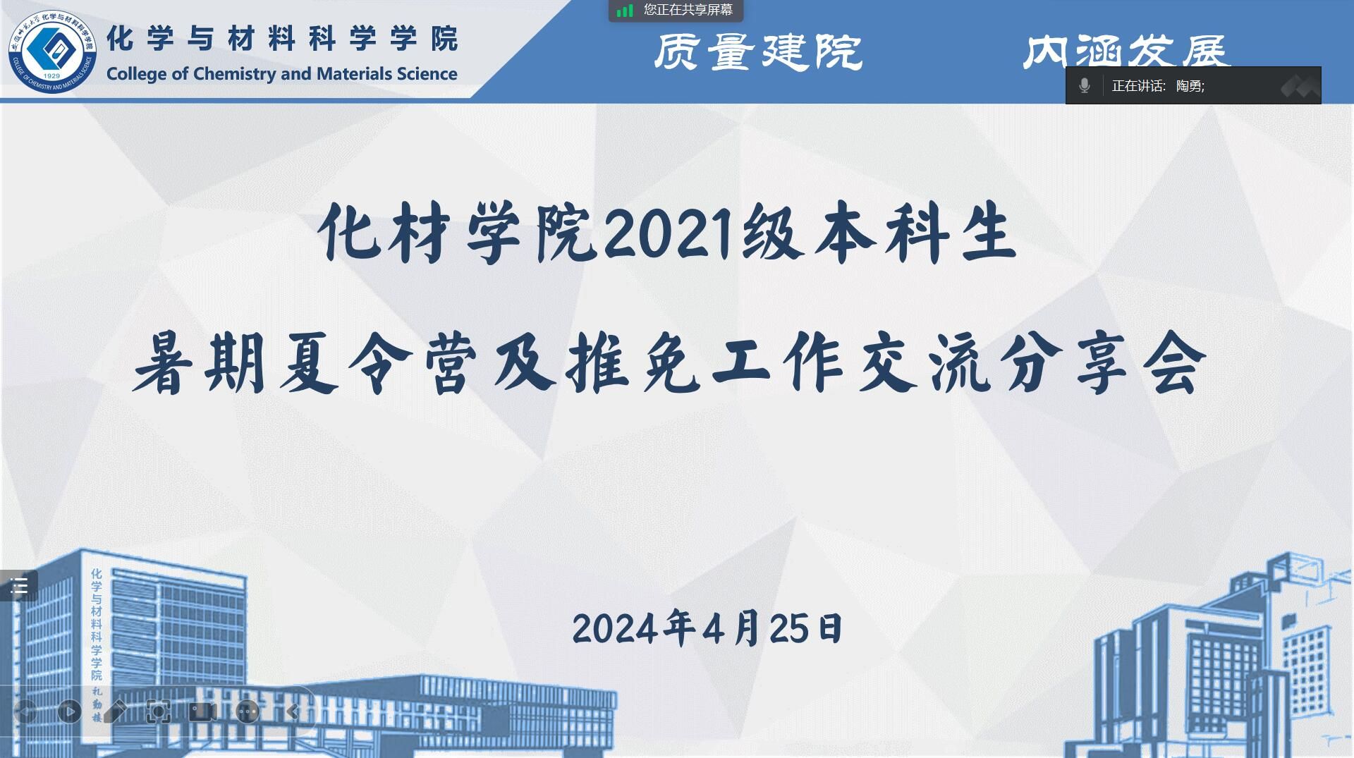 班会之后,陶勇利用腾讯会议举办了2021级本科生暑期夏令营及推免工作交流分享会,本次活动邀请了学院2024届获得推免资格的胡悦悦、王子源及2022届推免生、现就读于中国科学技术大学无机化学专业的黄宁宁三位同学分享获得推免资格的经验。会议由辅导员陶勇主持,51吃瓜网