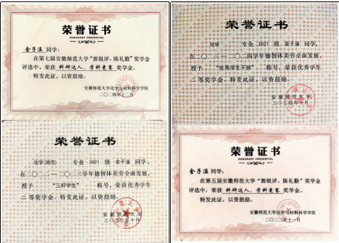 2021级化学专业本科生,"挑战杯"双铜奖获得者,2024年安徽省普通高等学校优秀毕业生。