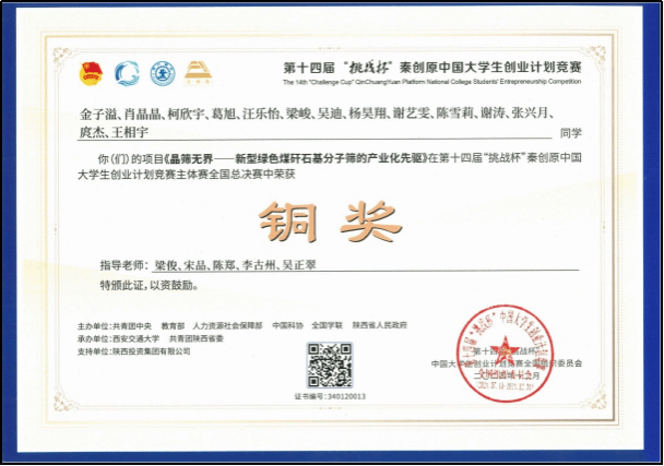 她作为国家级大学生创新创业项目《晶筛无界-新型煤矸石基分子筛的产业化先驱》第一负责人,带领团队攻克煤矸石制分子筛技术难题。两年间,从原料配比到催化机理研究,从实验室合成到产业化可行性分析,累计完成127组实验数据采集。该项目先后斩获第十四届"挑战杯"国家级铜奖、第一届中国国际大学生创新创业大赛国家级铜奖,实现学院在该项赛事上的新突破。