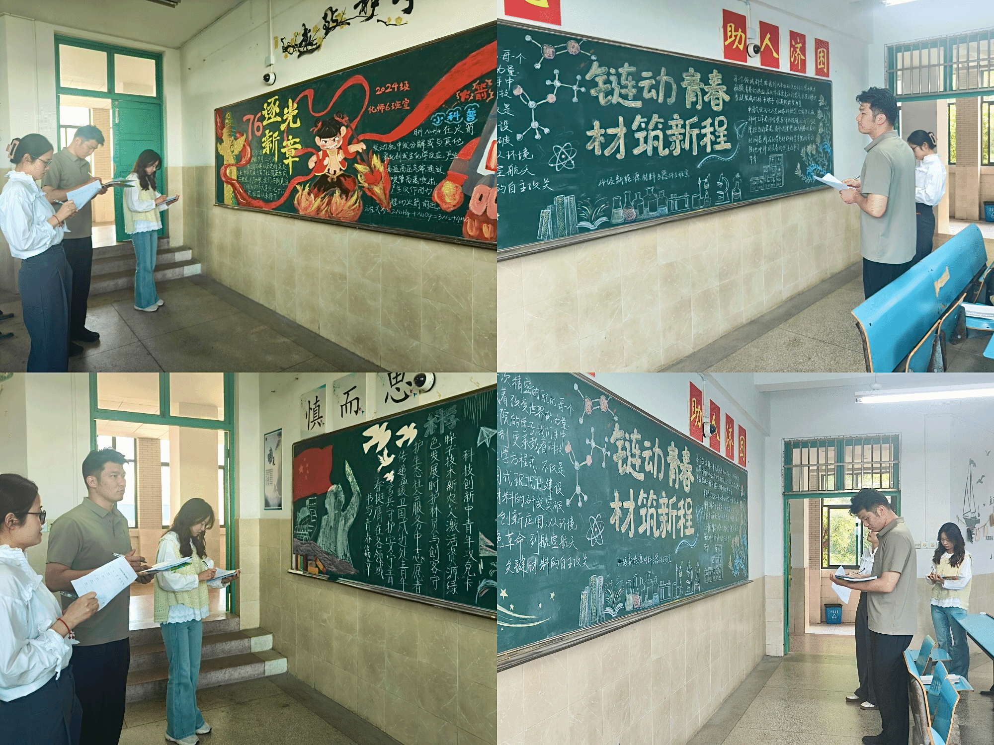 团委书记梅冠东、23级辅导员王霞老师、24级辅导员杨洋老师组成的评审团,深入各班级进行现场打分。评委们从主题契合度、板书设计、色彩搭配、创新亮点等多个维度综合考量,秉持公平公正的原则,对各班黑板报作品进行细致评审。