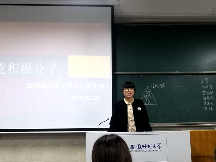 本网讯(2018级化学师范专业 张小楠)2018级化学师范班级同学于3月20日晚在固定教室2010301开展入党推优和两会学习活动,同学和老师都积极参与其中。 辅导员程紫丹向同学们介绍一些入党知识,加强同学们作为入党积极分子发展对象应有的责任感和使命感,也更加坚定了早日成为入党积极分子的决心。他强调入党不是利益,是责任;不是索取,是奉献;不是口头,是行动。同时,程紫丹老师结合马斯洛需求层次理论及自身的成长经历,教育同学们要在祖国的建设中实现自己的人生价值。随后,共有十三名符合条件的同学依次上台表达了自己想要积极加入党组织的愿望。班级同学进行了无记名投票。 之后,由团支书负责学习两会精神活动,“学会贯彻两会精神,践行社会时代革命”!全国两会作为中国政治生活中的一件大事,得到了舆论的密切关注。经过今天的学习,我们收获满满:关于两会的冷知识;观看明星冯巩和支教教师支月英的采访视频,从不同的方面更深层次地解读两会。 少年强,则国强!教师是一门职业,我们既然选择了化学师范专业,就应该热爱它。为实现中国梦出一份力!
