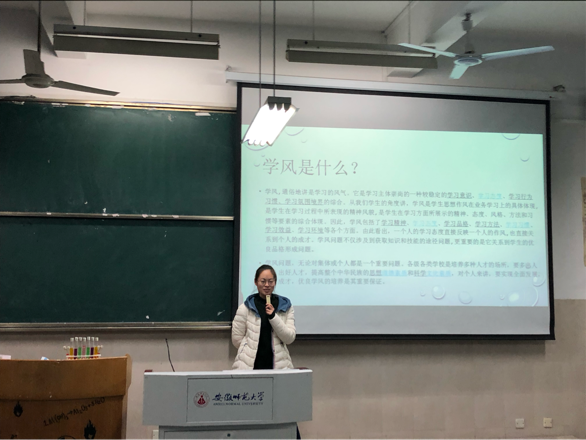 本网讯(18材料化学 朱莹珊)2018年12月12日晚七点,在行知楼2030103教室材料化学二班开展了主题为“学风建设”的主题班会。本次主题班会由学习委员曾繁轩同学主持进行,参加本次活动人员为材料化学二班全体同学。 班会就本班半学期以来的学风、整体学习成绩在年级的水平、学习经验交流以及同学之间的互助情况等展开。首先学习委员指出,本班自主学习方面仍需加强,并用具体数据以寝室为单位说明整体成绩所在位置,鼓励同学应该更加努力学习。之后由各寝室代表发言,分享学习方法以及经验,这让在座的同学们受益匪浅。最后,12月四六级大战即将来临,四级备考计划应运而生,鼓励同学们能做最后的考前冲刺。 学风是学生思想道德品质、学习精神和综合素质的重要体现,是学生成长的基础和前提。此次主题班会的开展,使同学们的学习热情与思想觉悟有了进一步的提高,同时也更加确立了自己的人生目标,明确了自身未来的发展方向,起到了加强班级学风建设和创建和谐校园的良好效果。