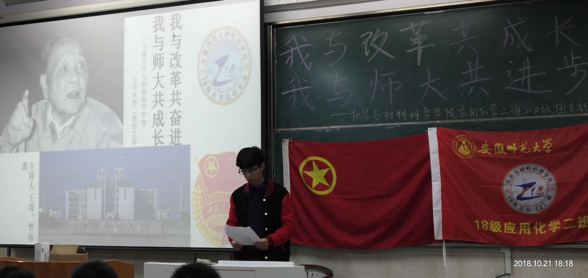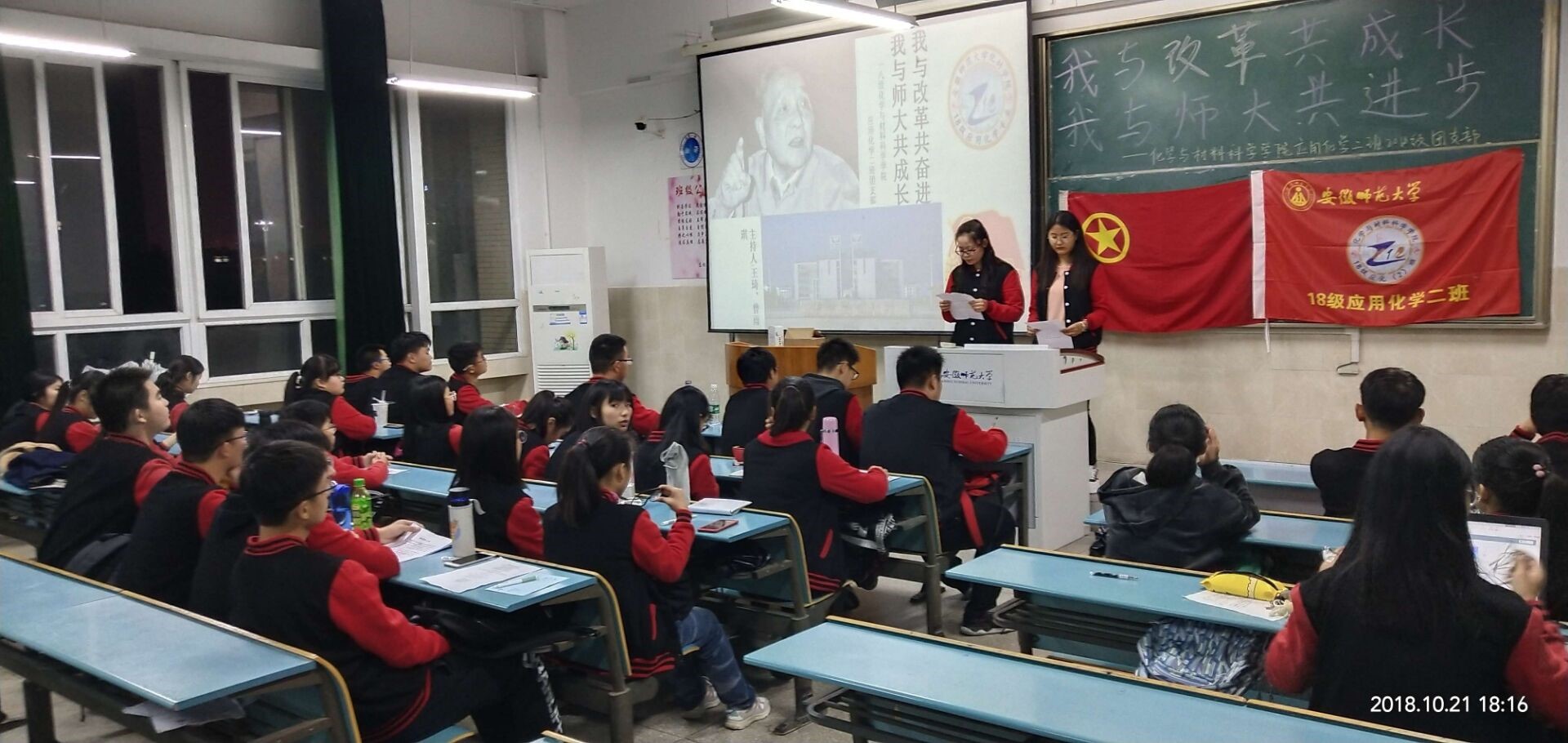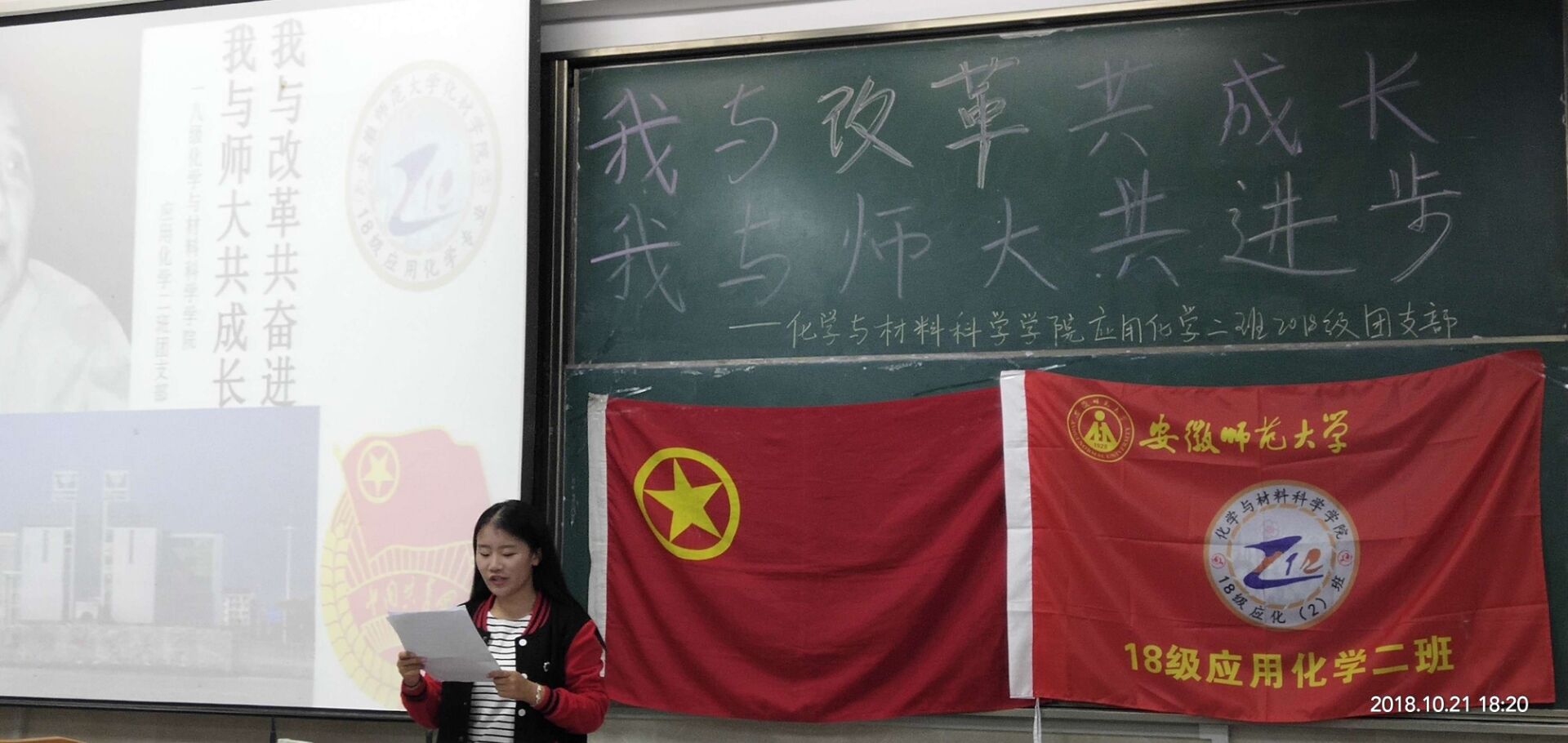 本网讯(应用化学2班 汤楠)2018年10月21日晚6点,18级应用化学2班全体同学在开展了以“我与改革共奋进,我与师大共成长”为主题的团日活动,活动由团支书王琦和认证委员曾雨琪的共同主持。2018年是中国改革开放40周年,40年风雨征程,中国共产党团结带领人民创造了“人类发展史上最激动人心的奇迹”,更实现了从“赶上时代”到“引领时代”的伟大跨越。旨在让当代大学生明白改革的重要性,懂得站在新的历史起点上进一步凝聚改革共识,不断提高自身科学文化素养。