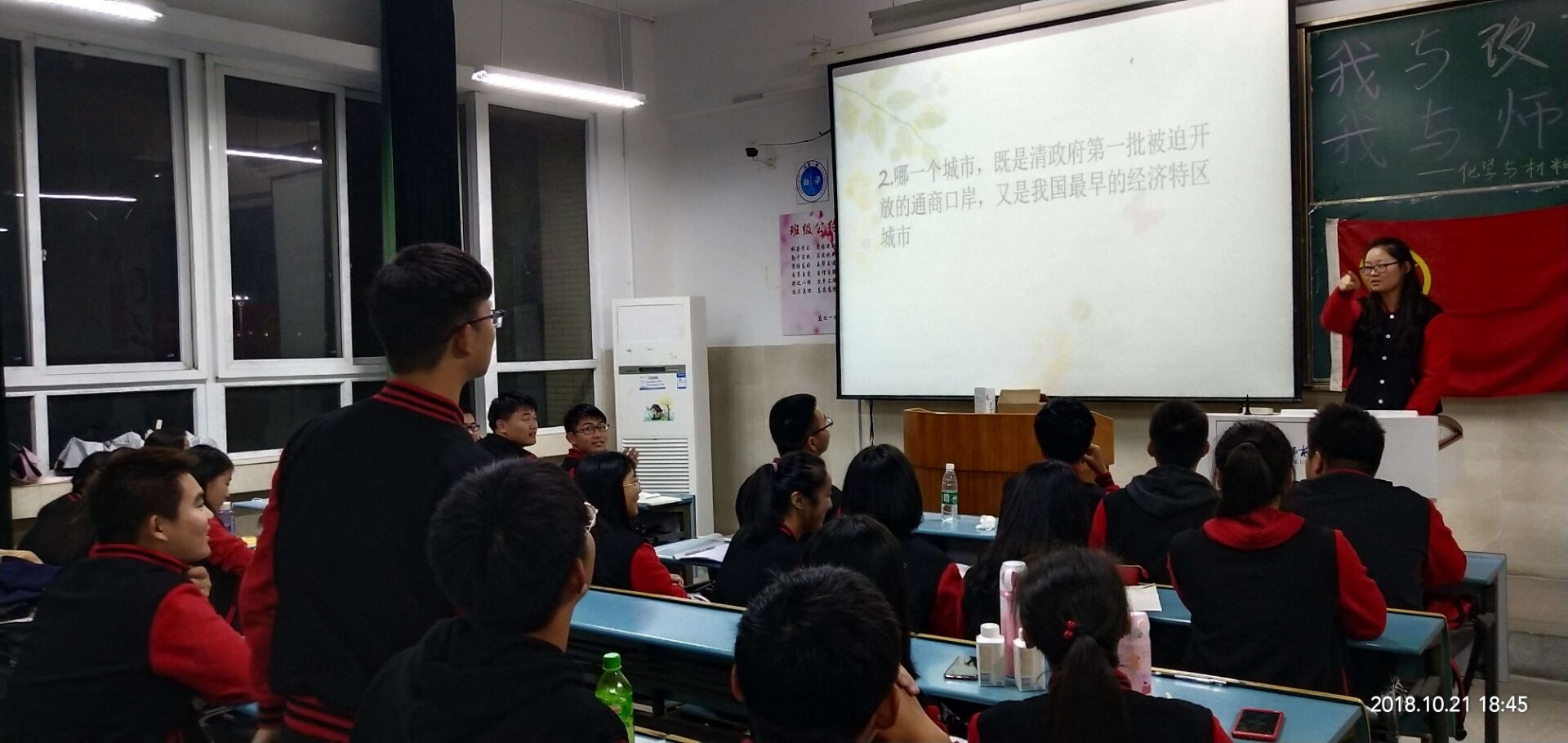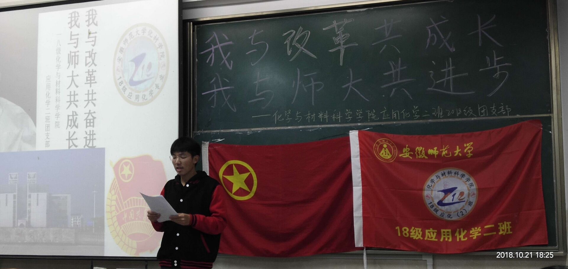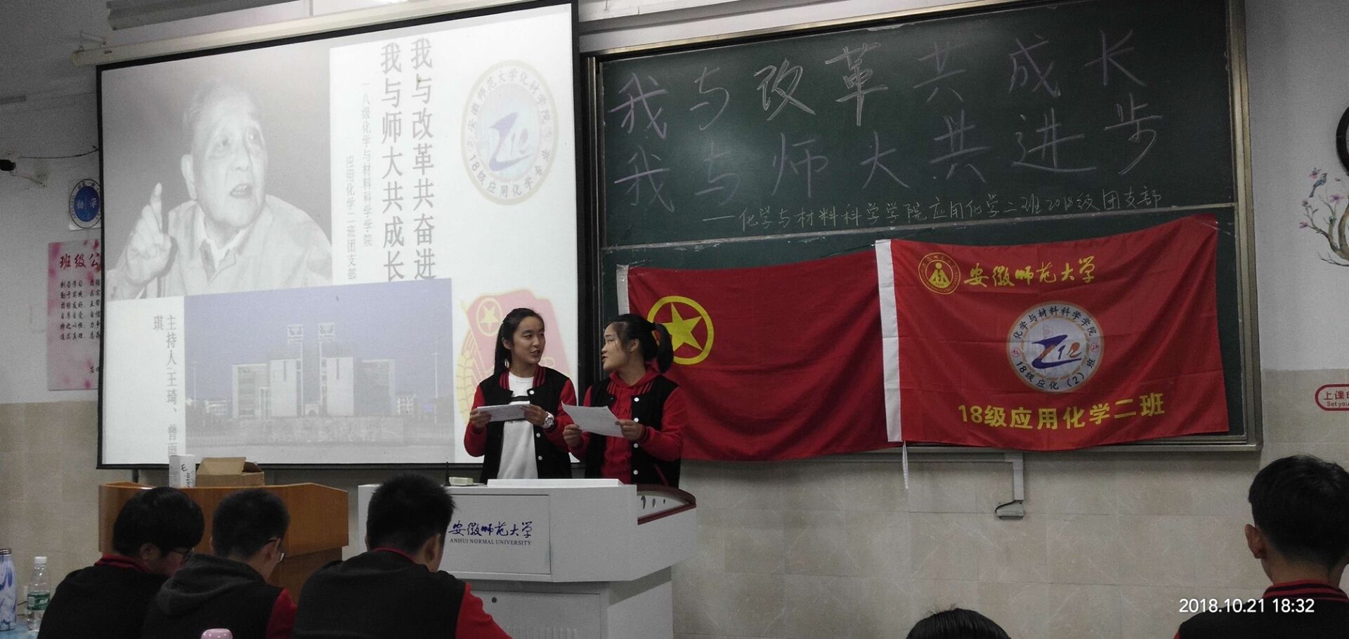 本网讯(应用化学2班 汤楠)2018年10月21日晚6点,18级应用化学2班全体同学在开展了以“我与改革共奋进,我与师大共成长”为主题的团日活动,活动由团支书王琦和认证委员曾雨琪的共同主持。2018年是中国改革开放40周年,40年风雨征程,中国共产党团结带领人民创造了“人类发展史上最激动人心的奇迹”,更实现了从“赶上时代”到“引领时代”的伟大跨越。旨在让当代大学生明白改革的重要性,懂得站在新的历史起点上进一步凝聚改革共识,不断提高自身科学文化素养。