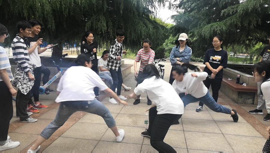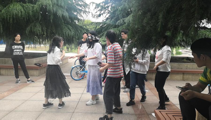 在第一个活动中,每个团小组分别派出一名成员参与比赛,用衣服蒙住眼睛,在小组其他成员的共同指挥下,通过一个个障碍,最终到达终点。在这个活动中,同学们之间的同窗之情得以增强,各团小组之间的凝聚力得以提升。