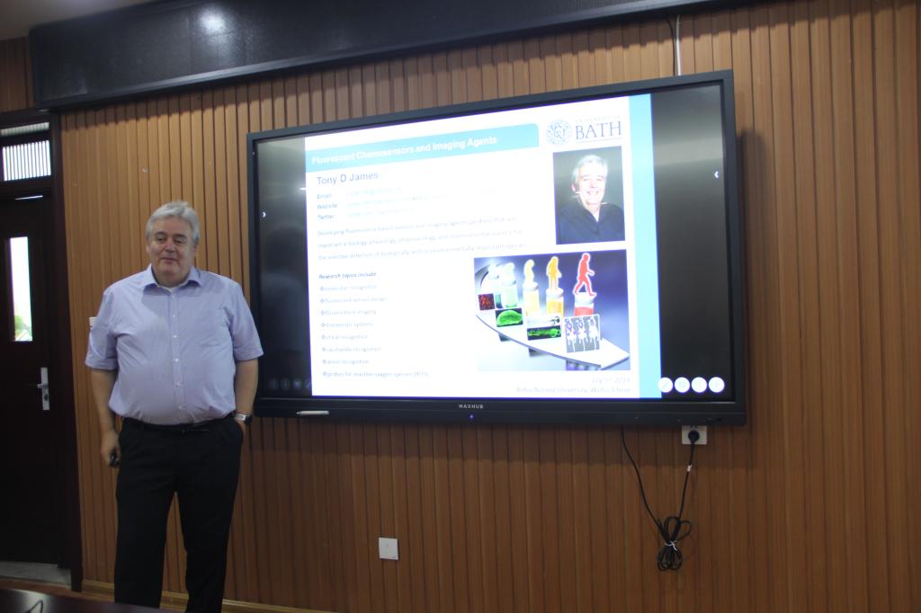 托尼·D·詹姆斯教授作了题为“Fluorescent Chemosensors and Imaging Agents”的学术报告。托尼·D·詹姆斯教授首先介绍监测生理、环境和工业情景中分析物的能力至关重要。由于识别事件发生在分子水平,收集和处理信息构成了一个基本的挑战。因此,强大的化学分子传感器“化学传感器”能够选择性地检测选定的分子,并发出这种存在的信号,这吸引着相当大的关注。随后重点介绍使用硼酸为二醇、阴离子和活性氧/氮(ROS/RNS)开发的荧光探针。模拟自然界复杂程度的设计和生产化学传感器,能够确定目标物种的浓度(和位置),包括:糖类,糖化蛋白,阴离子和活性氧/氮物种(ROS/RNS)。本次报告使与会师生受益匪浅,进一步激发了大家对科研工作更大的热情。