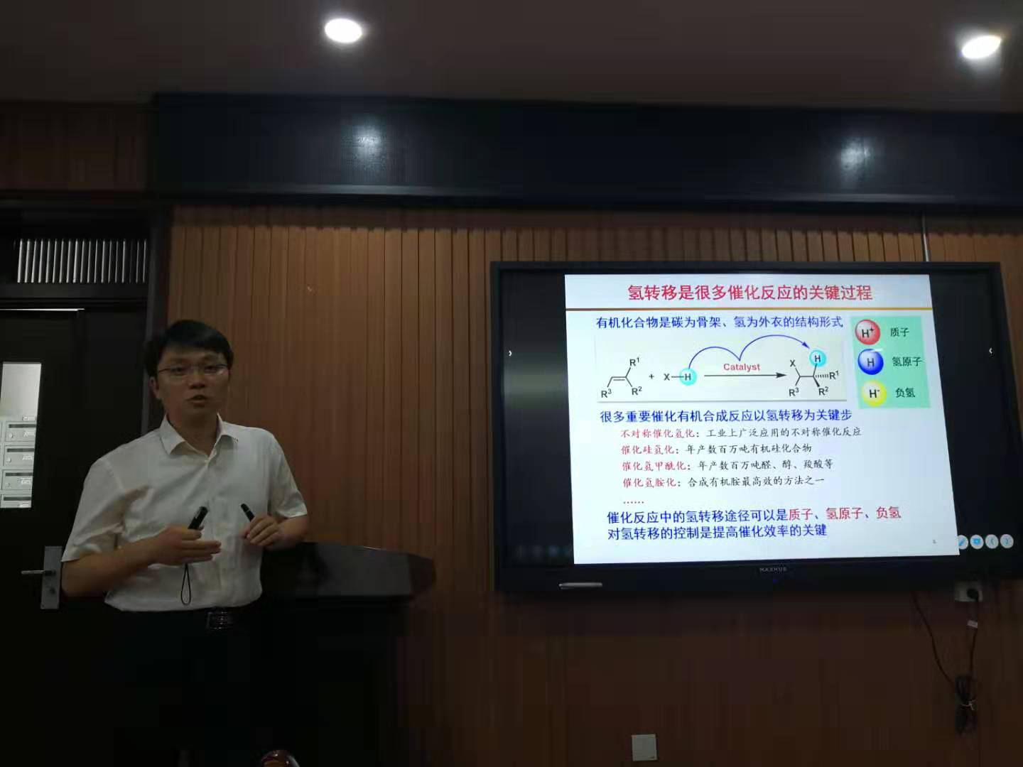 朱守非教授作了题为“催化氢转移反应”的学术报告,朱教授首先介绍由于有机物通常含有氢元素,因此很多催化有机合成反应都存在氢转移过程。从研究催化反应中的氢转移过程入手,发展氢转移催化剂和调控策略,是提高催化效率的一种思路。近年来,重点研究了几类以氢转移为关键步骤的重要催化有机合成反应,主要取得以下进展:1、提出了“手性质子梭”概念,实现了金属催化活性中间体质子转移的直接手性控制,为催化不对称质子转移反应提供了新的解决方案,实现了卡宾对杂原子氨键插入、NAZAROV环化等富有挑战的重要不对称催化反应,为α-氨基酸等重要手性砌块提供了高效合成方法。2、发现了催化卡宾对硼氢键插入新反应,实现了其不对称转化,并阐明了硼烷的氢转移机制,为有机硼化合物的合成提供了新的方法。3、发展了邻菲罗啉配体修饰的铁系金属催化剂,实现了铁系金属催化的烯烃氢化和硅氢化反应,发现了铁系金属催化剂的自旋态在调控负氢转移反应活性和选择性发挥了重要作用。报告结束后,朱守非教授与会师生就相关问题进行互动交流与讨论。