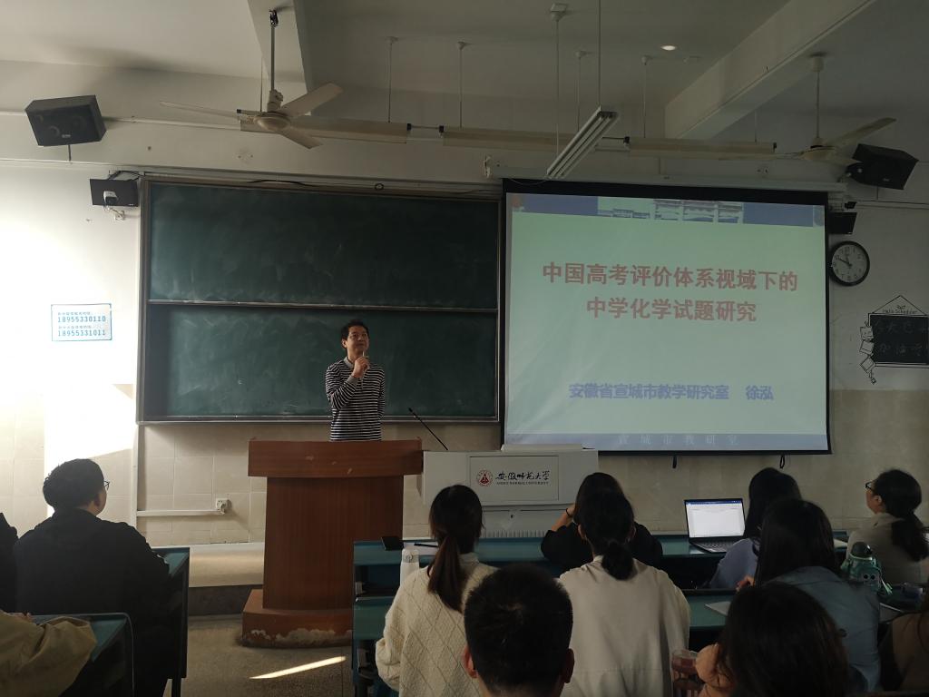 邀请安徽省宣城市教学研究室化学教研员、正高级特级教师徐泓作题为《中国高考评价体系视域下的中学化学试题研究》的专题报告,这是2020年“中学化学名师讲坛”系列活动的第七讲。报告会在花津校区1号教学楼多媒体教室举行。2018级化学专业师范生、化学教学论专业研究生及部分化学教学论专业教师共一百三十余人参加了此次报告。