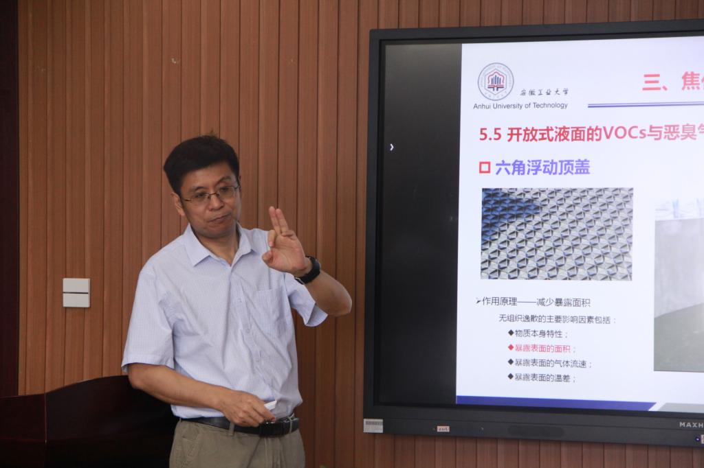崔平教授作了题为“焦化工业大气污染物治理”的学术报告。崔教授首先介绍了国内外大气污染物以及污染情况和治理措施,提出了大气污染物治理存在的一些问题,接着引入了焦硫烟气脱硫脱硝技术,并讲述了该技术的核心是由人工水热合成的硅铝酸盐和催化活性组分构成,具有较高的效率及使用寿命,且焦炉烟气脱硫脱硝的余热可以回收利用。并阐述了焦化VOCs治理技术,主要是灌区(甲醇)VOCs零排放技术,应用氮封技术从源头减少VOCs的排放量,排放的气体汇集后,送至锅炉燃烧成水和二氧化碳排出,实现VOCs零排放。最后介绍了其课题组在该领域所做的工作和对未来的预期以及一些思考。会后,崔教授就会议内容与会师生进行了交流与讨论。