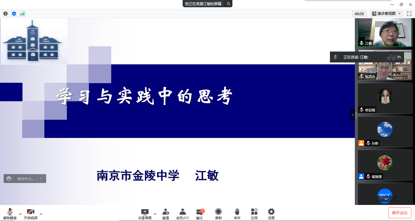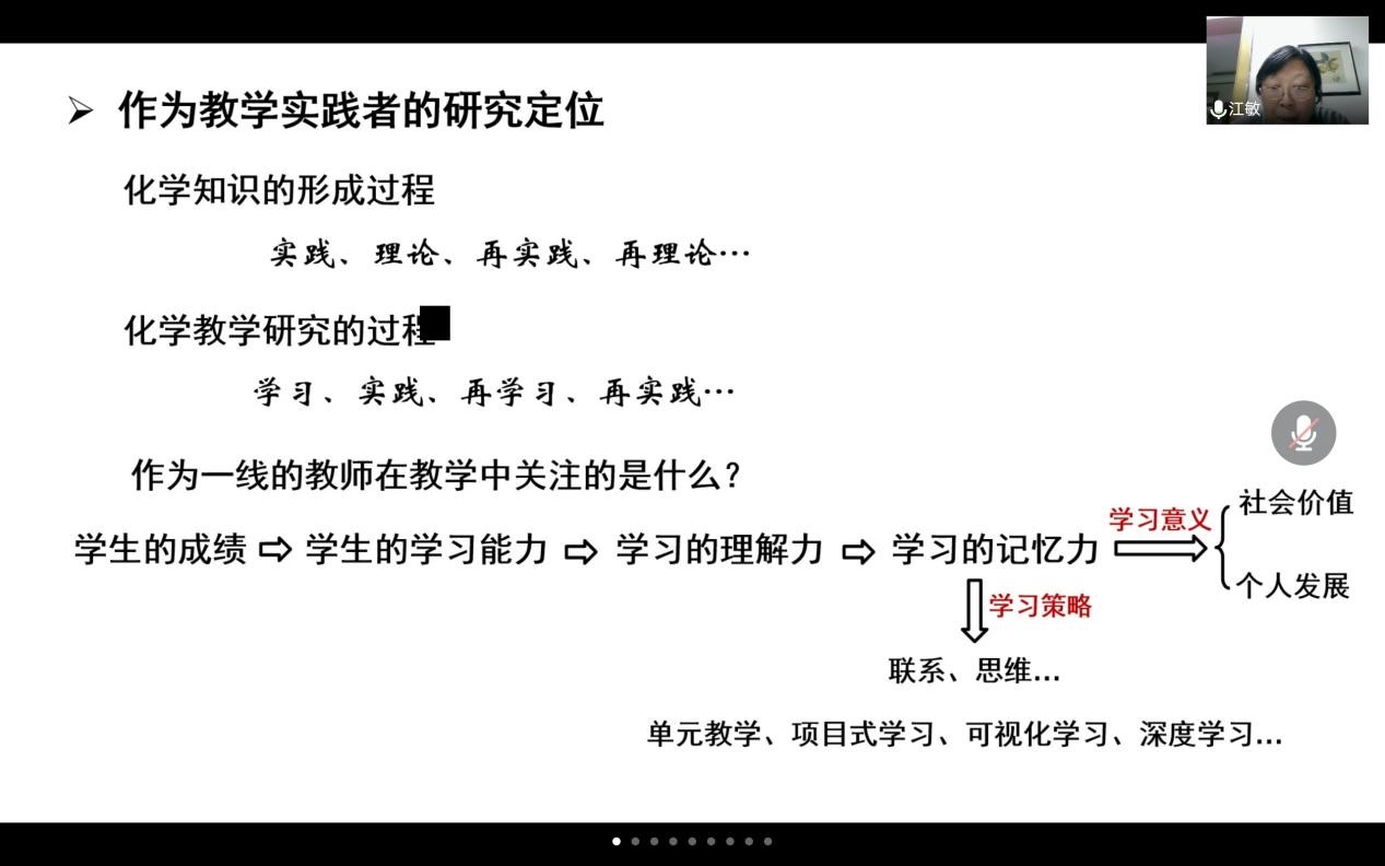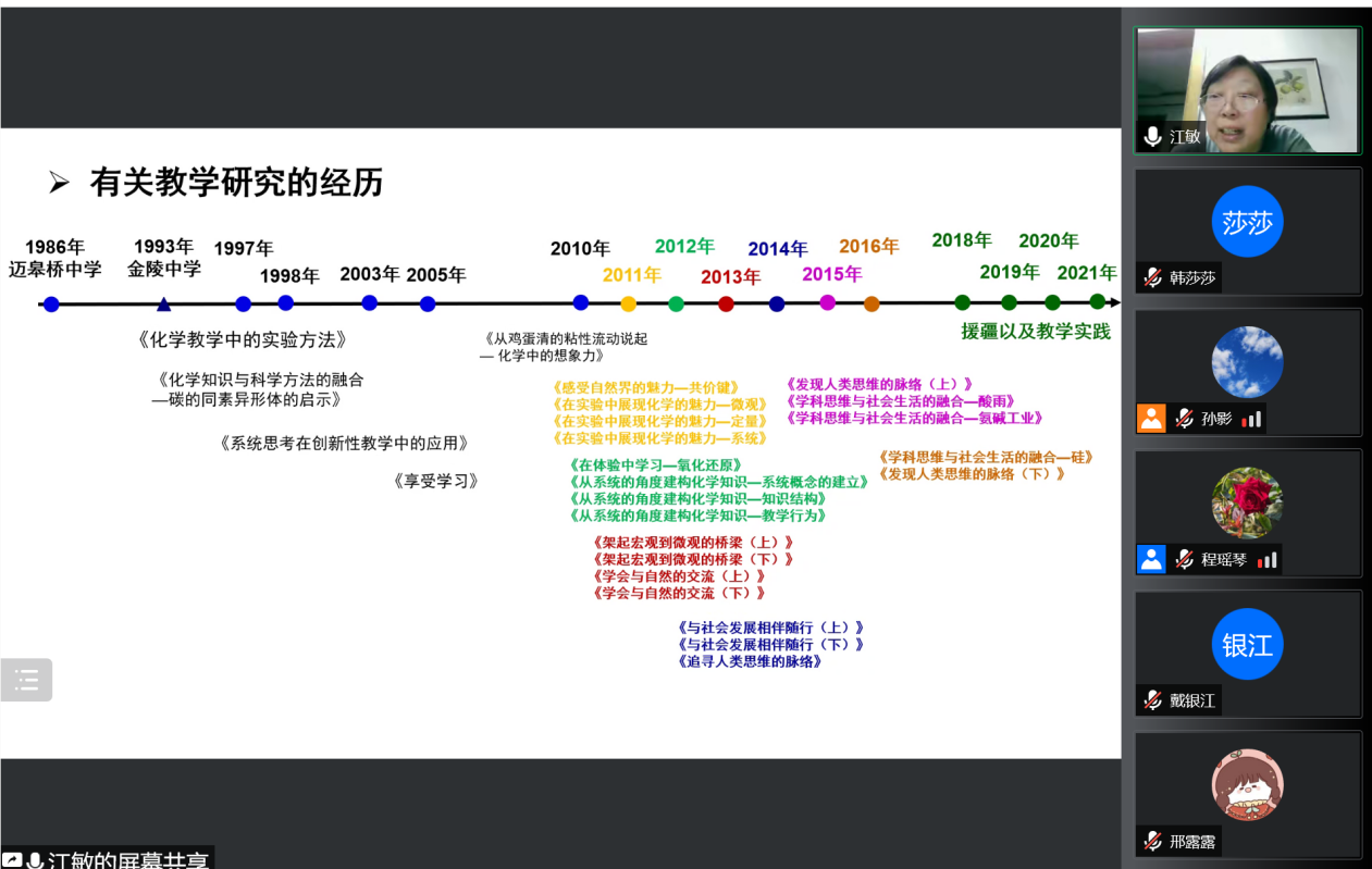 韩莎莎)2022年6月6日晚,江苏省化学正高级特级教师江敏老师应邀为化学教育专业研究生作专题报告——学习与实践中的思考。本次报告通过腾讯会议线上开展,由孙影教授主持,化学教育专业研究生及教学论教师共同参加。