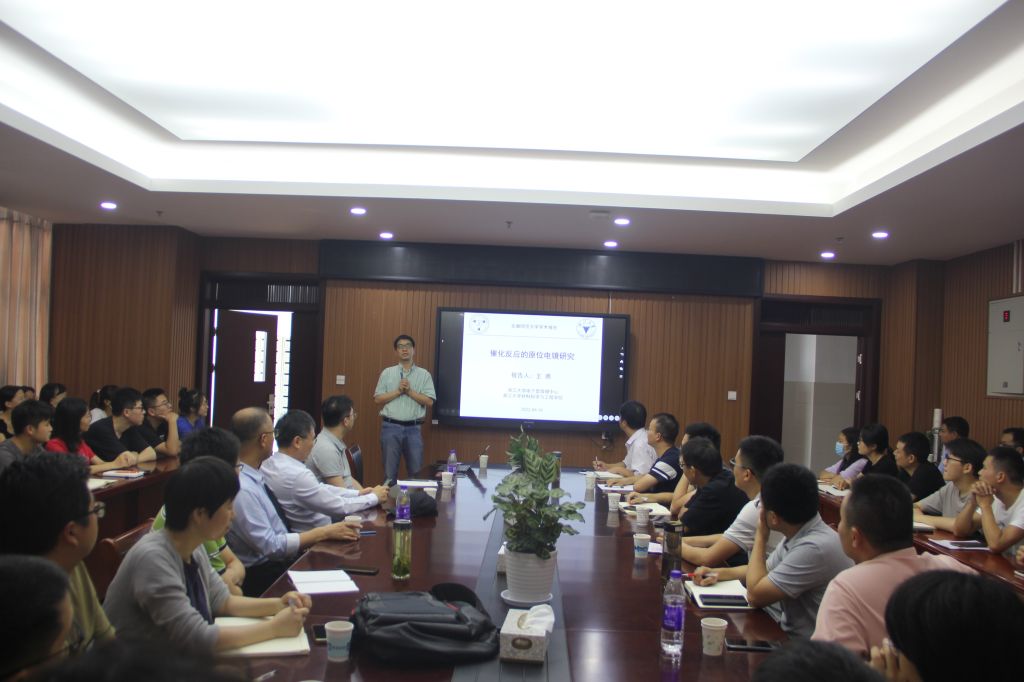 王勇教授做了题为“催化反应的原位电镜研究”的学术报告。王教授首先介绍了催化反应原位电镜的研究背景,接着介绍了锐钛矿TiO2(001)表面的特点,通过实验确定重构表面的原子结构、水分子在氧化钛表面的动态行为等。随后王教授讲述了课题组的一些进展,提出了“双触角”结构模型、直接确认活性位点和首次观察到气固催化反应,活性位点吸附分子结构随时间的动态演变,活性位点的精准确认与外场调、活性位点的失活与防治。会后,王教授与参加会议的师生进行一系列的学术讨论与交流。