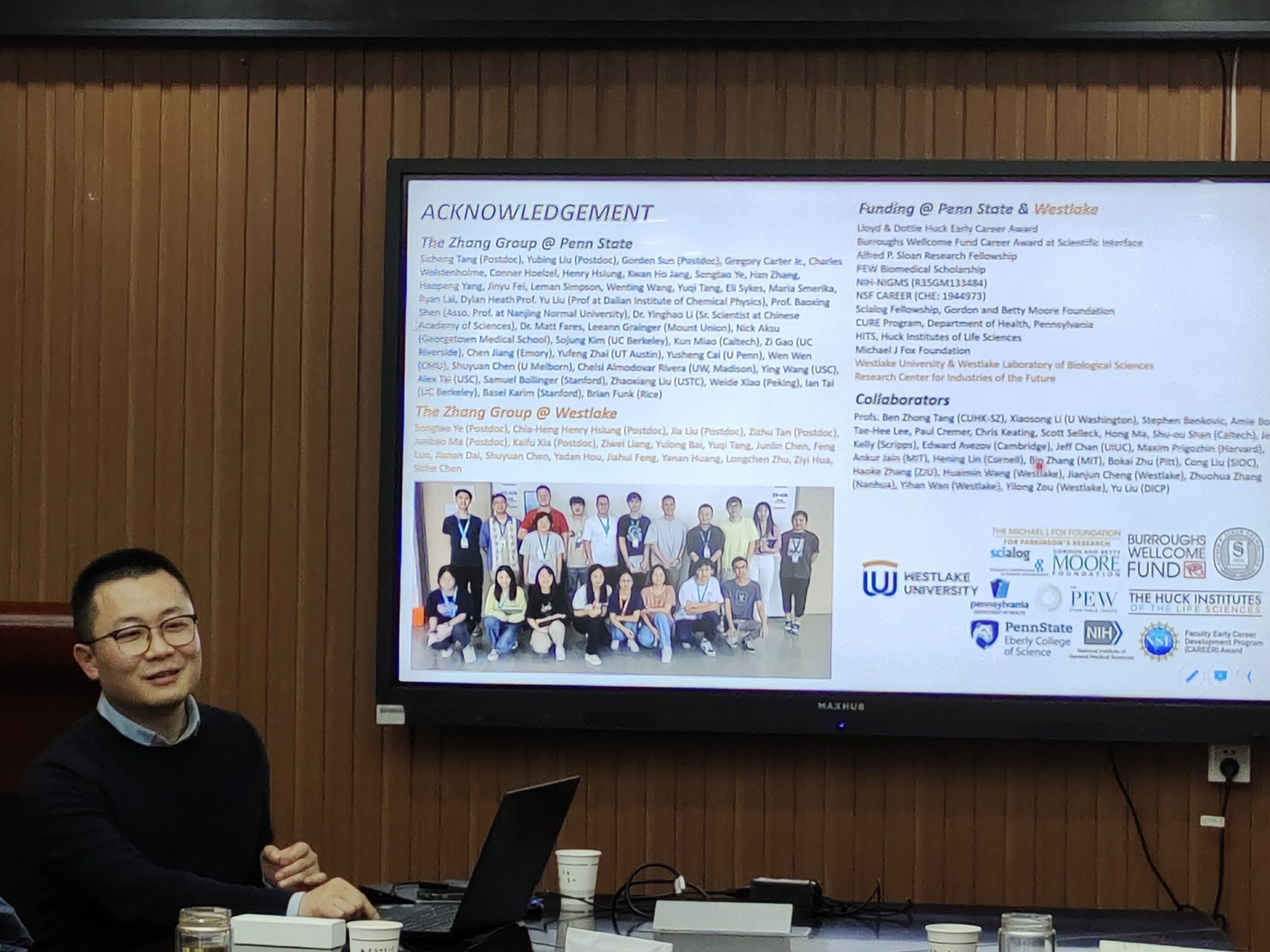 张鑫教授作了题为“蛋白质聚集的化学生物学”的学术报告。张教授首先介绍了蛋白质的折叠、变形、聚集,以及蛋白质的错误折叠和聚集会导致的疾病。研究发现,在淀粉样蛋白的聚集过程中,其毒性不仅来自蛋白质的不可溶聚集体,而且主要来自可溶性、错误折叠的蛋白质聚集体在细胞内的积累。随后张教授阐述了可以在活细胞中直接监测不同聚集态蛋白质的两种类型的荧光AggTag小分子探针,这两类探针可以可视化并区分可溶性蛋白质聚集体和固态蛋白质聚集体。最后张教授介绍了其课题组目前所做的工作,即定量细胞蛋白质组应激和恢复,活细胞中蛋白质聚合过程的直接可视化,以及探索和调节无膜细胞器中的蛋白质聚集。会后,张教授就报告内容与与会师生展开了一系列的学术讨论与交流。