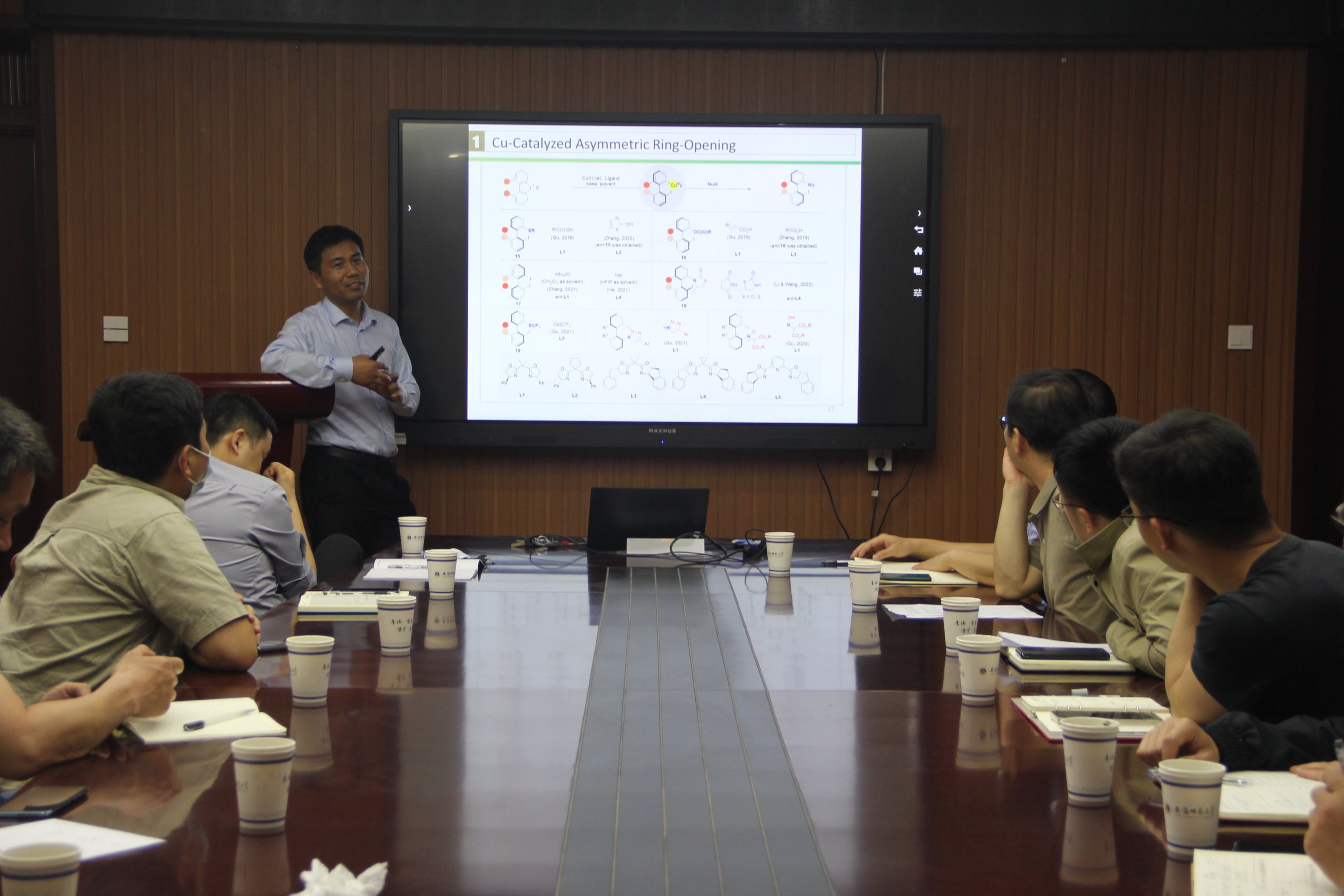 顾振华教授作了题为“扭转张力促进的不对称开环反应”的学术报告。顾教授首先介绍了通过金属催化的开环反应构建阻旋手性的方法。提出了“扭转张力促进不对称开环”的新理念,将其与金属有机化学的基元反应相融合,实现了碳-碳、碳-杂原子键的选择性切断,为功能化手性联芳基化合物高效合成提供了独特方法。会后,顾教授与参加会议的师生展开了一系列的学术讨论与交流。