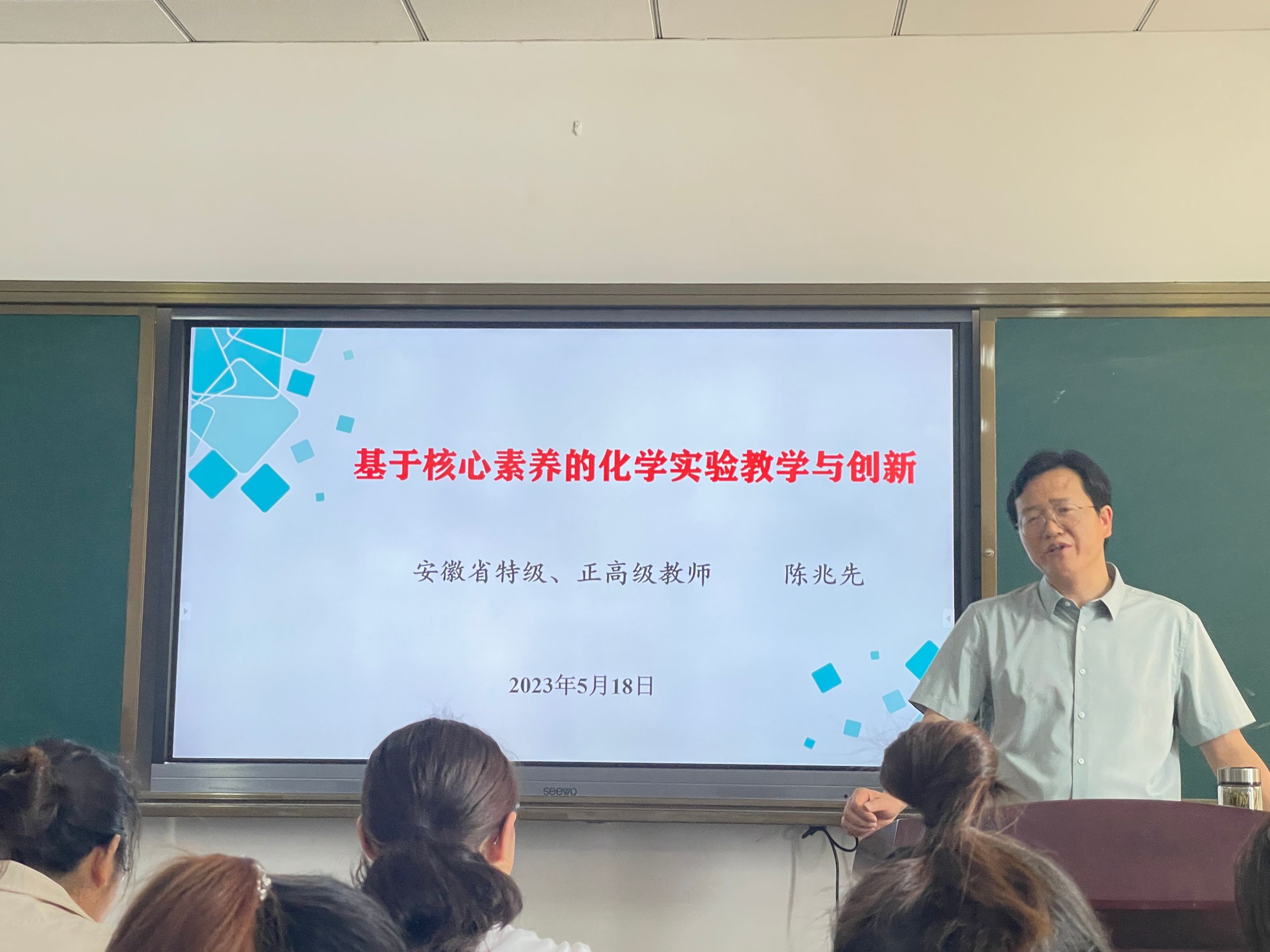 田一鸣)5月18日上午,安徽省特级/正高级教师、霍山县教研室主任、中学化学教研员陈兆先应邀为化学教育研究生作专题报告,本次报告以“基于核心素养的化学实验教学与创新”为主题,线上线下同时展开,报告由孙影教授主持,化学教育专业研究生、教学论专业教师共同参加。