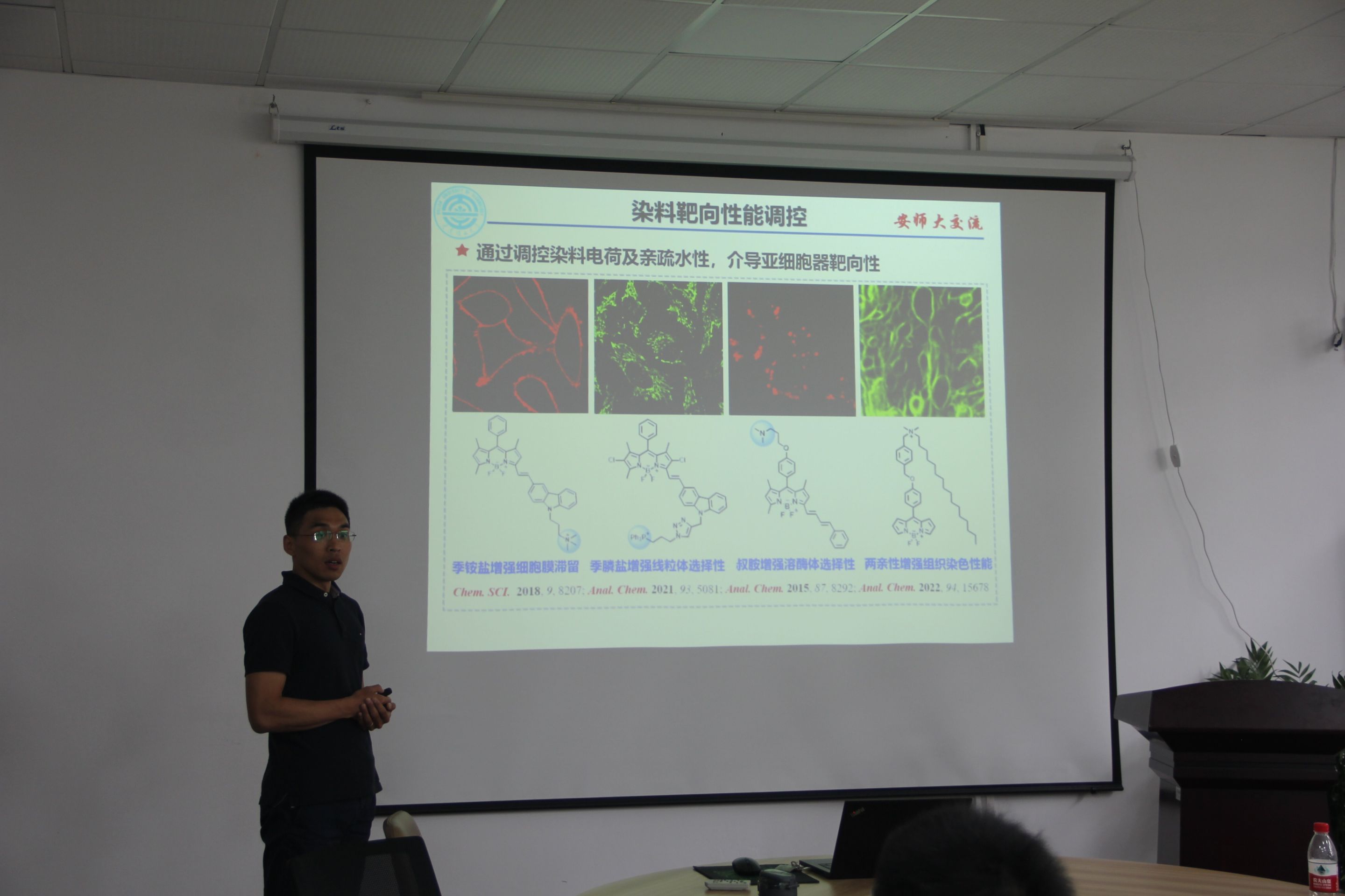 张新富博士作了题为“Live Sensors精准定量生物过程界面处pH值”的学术报告。张博士首先简要介绍了课题组的研究方向,聚焦诊疗试剂的靶向性设计,创制靶向型功能染料及诊疗策略。可将其概括为三个方面,分别是亚细胞靶向调控,活体病灶靶向调控以及动态病原体靶向性诊疗。接着介绍了如何进行染料的靶向调控,通过调控染料电荷及亲疏水性,介导亚细胞器靶向性。随后阐述了其近期工作。如何提升靶向的智能性、如何提升靶向的精准性。最后,张博士对Live Sensors精准定量生物过程界面处pH值进行了总结。会后,张博士与参加会议的师生展开了一系列的学术讨论与交流。