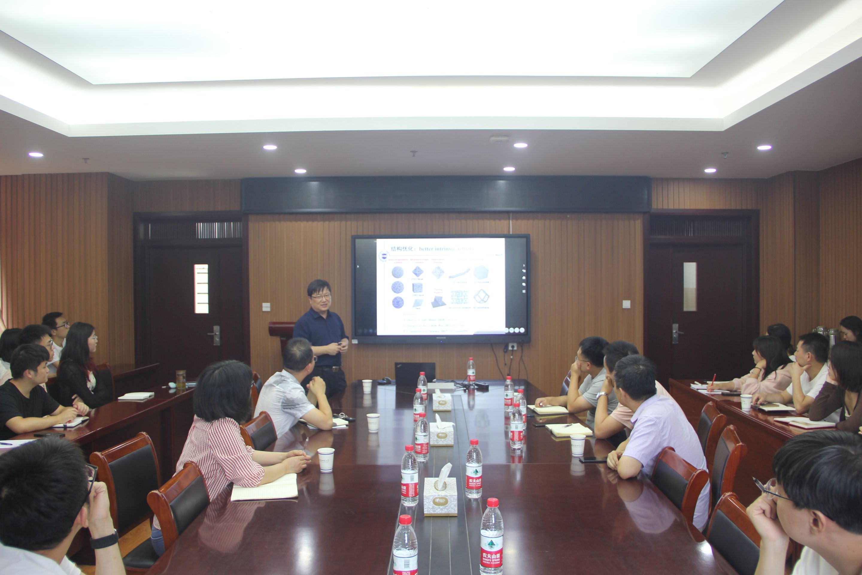孙晓明教授作了题为“气体超浸润纳米阵列电极及氢能应用”的学术报告。孙教授介绍了气体参与的电化学反应主要包括:气体“溢出”和“吸收”反应,二者是影响电催化效率及相应器件性能的关键因素。对于气体溢出电催化反应,产生的气泡如果不能及时离开电极表面,就会积聚成气膜覆盖在表面,减小有效的催化面积,增加电解质的扩散阻力和极化效应,最终导致能量损耗增加。通过构筑一系列有序微纳结构得到了不同的水下超疏气电极分别用于析氢、析氧反应等,能够提高电催化效率。同时在气体消耗反应中,通过构筑微纳结构“超亲气”电极,能提高“耗气”反应的电催化效率。通过构筑微纳结构提升气体扩散性能,与掺杂、负载等方式调变材料的本征活性,对于提升电极的催化性能同样重要。会后,孙教授与参加会议的师生展开了学术讨论与交流,对与会师生提出的相关专业问题进行了详细的解答,现场气氛热烈。