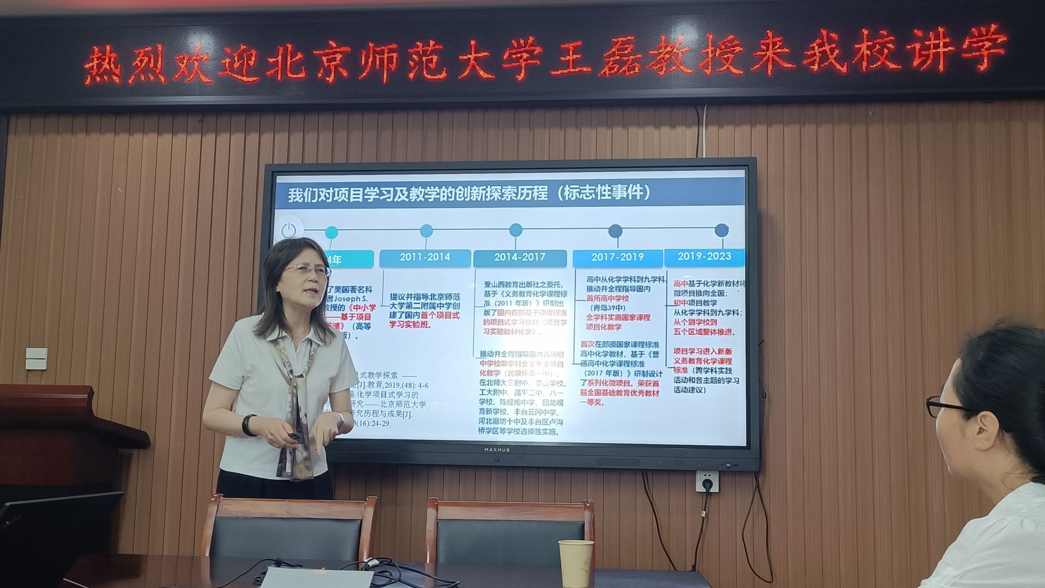 科学教育是国家的重大战略需求,王磊教授围绕“基于项目学习和教学提升科学教育质量的实践与研究”为主题展开讲座,首先,基于新课标提出了基础科学教育高质量发展的新要求,其中包含科学思维、态度责任、探究实践、化学观念四个方面。新课标的新要求提出设置核心素养导向的学习主题、构建大概念统领多维课程内容结构、化学与社会及跨学科学习既集中呈现又融入在各主题中。基于项目学习和实验探究学习各主题,倡导做中学、用中学、创中学,自主、合作、实践、创新。最后王磊教授针对项目学习提出了相应的学习活动建议,以及落实新课标需要项目学习和教学,强调基于学习主题和大单元整体,大概念统领的多维内容结构,科学认识与科学实践相结合,以及核心素养导向教、学、评一体化。会后,王磊教授与参会师生展开了一系列学术讨论,并回答了与会师生提出的问题。