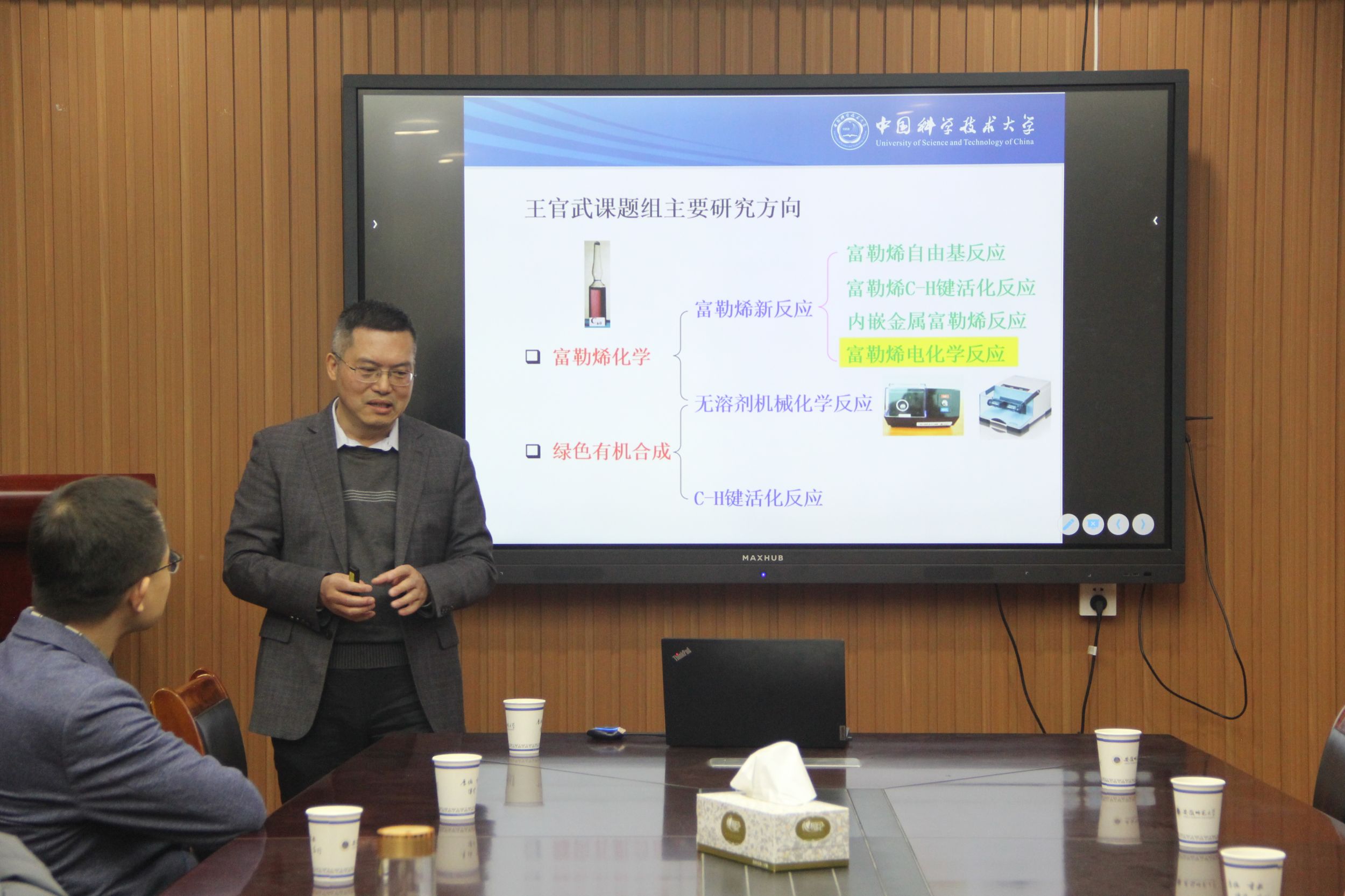 王官武教授作了题为“富勒烯衍生物的电合成及其光伏应用”的学术报告。王教授阐述了采用电化学“极性反转”策略,通过恒电位电解使富勒烯衍生物变为二负离子,然后与一系列亲电试剂发生反应,获得新颖加成模式、结构多样的功能富勒烯分子,实现了首例Retro Baeyer-Villiger反应。部分合成的富勒烯衍生物被应用于太阳能电池器件中。会后,王官武教授就报告内容与与会师生展开了一系列学术讨论,并回答了与会师生提出的问题。