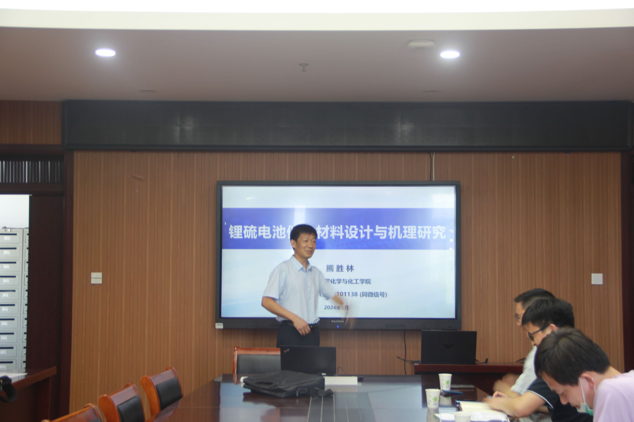 熊胜林教授作了题为“锂硫电池催化材料设计与机理研究”的学术报告。熊教授首先介绍了在介观尺度下如何实现新能源材料精准可控合成与组装的关键科学问题等。随后,熊教授讲述了锂硫电池的优势以及目前存在的一些缺陷。最后,熊教授阐述了以碳基材料为主体,基于结构导向合成策略,可控制备了一系列多活性位点的催化材料用于锂硫电池的正负极载体或隔膜修饰层,实现了对穿梭效应和锂枝晶的有效抑制。会后,熊胜林教授与参会师生展开一系列的学术讨论,并回答了参会师生提出的问题。
