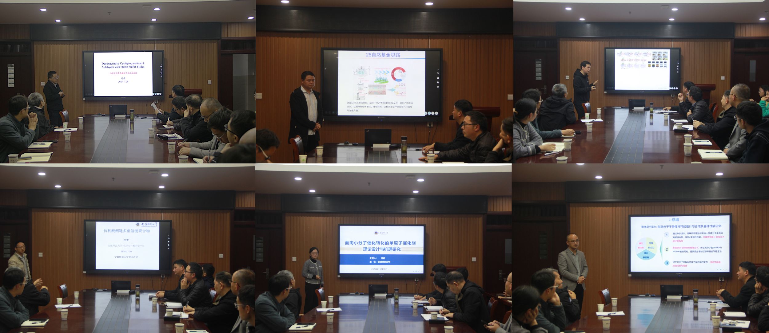 付亮、杨健、濮军、华赞、刘研、史永强等六位博士分别作了题为“Deoxygenative Cyclopropanation of Aldehydes with Stable Sulfur Ylides”、“电催化CO2的高值转化研究”、“过渡金属异质界面的构筑及其在锂硫电池中的应用探索”、“仿核酸侧链多重氢键聚合物”、“单原子催化剂的理论设计与机理研究”和“n~型高分子半导体材料的合成及器件性能研究”的学术报告。在报告之后,各位博士还分别介绍了2025年国家自然科学基金的选题思路、研究基础、拟解决问题等。