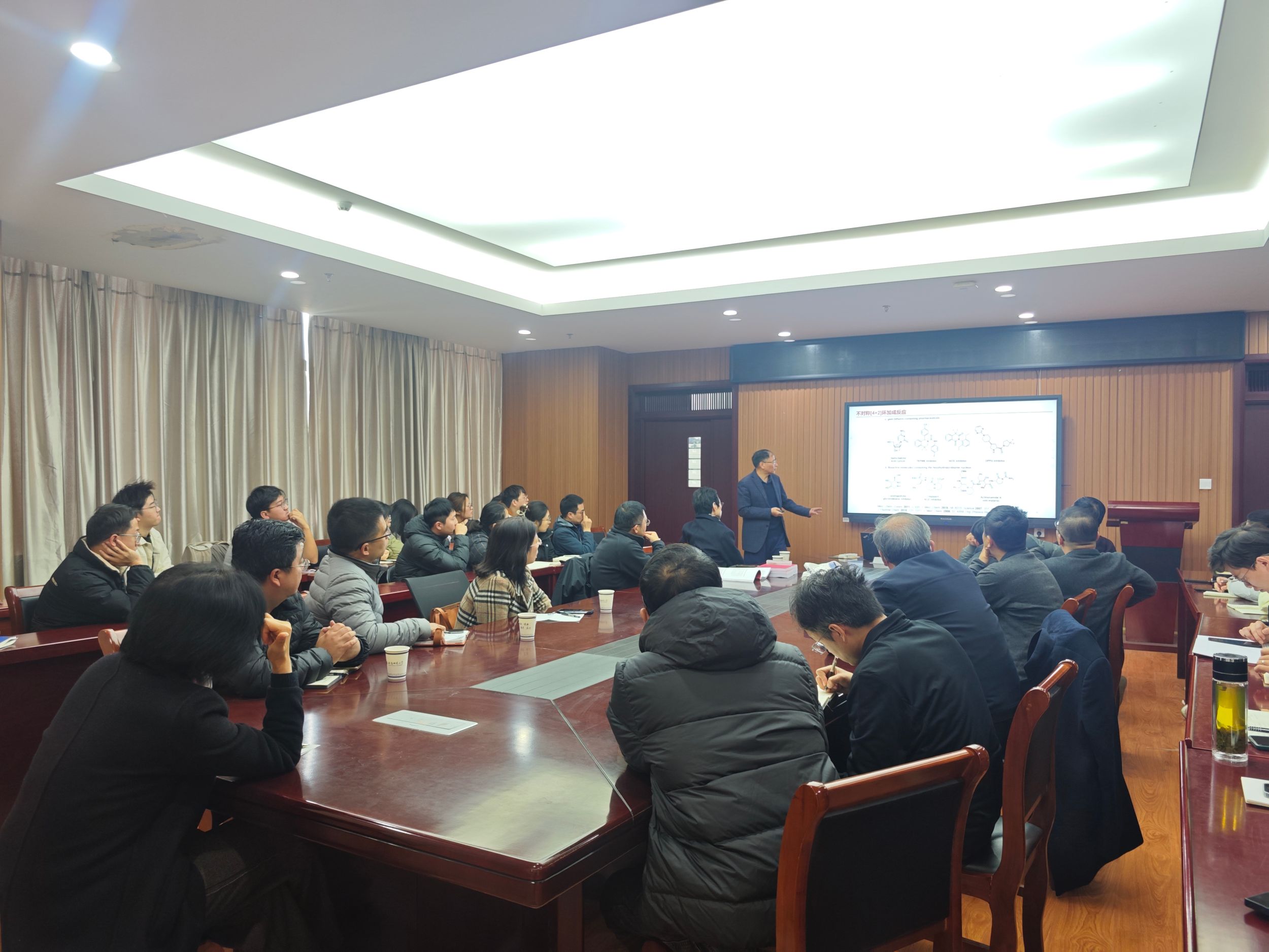 赵刚研究员作了题为“不对称催化合成含氟手性化合物”的学术报告。赵研究员分别从研究背景,研究条件,合成机理等方面讲解了关于合成含氟手性化合物的研究探索过程。研究背景方面,赵研究员讲解了有机氟化学的发展历程,以及目前含氟药物,含氟农药,含氟高性能材料在各领域占有较高比例。赵研究员还分享了构建含氟手性分子的策略,利用廉价、易得的含氟砌块制备手性含氟分子及中间体;基于共轭氟化烯烃光学性质设计、合成新型含氟功能材料。研究条件方面,赵研究员阐述了反应温度,溶剂,反应时间,催化剂当量对相关反应产量的影响。最后,赵研究员还介绍了偕二氟烯烃的反应类型和在环加成反应的相关应用。其中,偕二氟烯烃易于被亲核试剂进攻的驱动力主要来自以下四个因素:(a)因为两个氟原子的吸电子诱导作用,偕二氟亚甲基碳上的高度缺电子性;(b)与sp3杂化氟代烷烃相比,sp2杂化氟烯烃的热力学不稳定性;(c)相较而言,sp杂化使得β-氟碳阴离子的较稳定性;(d)偕二氟烯烃与亲核试剂的高反应性也取决于双键的极性。会后,赵刚研究员与参会师生展开了一系列学术讨论,并回答了参会师生提出的问题。