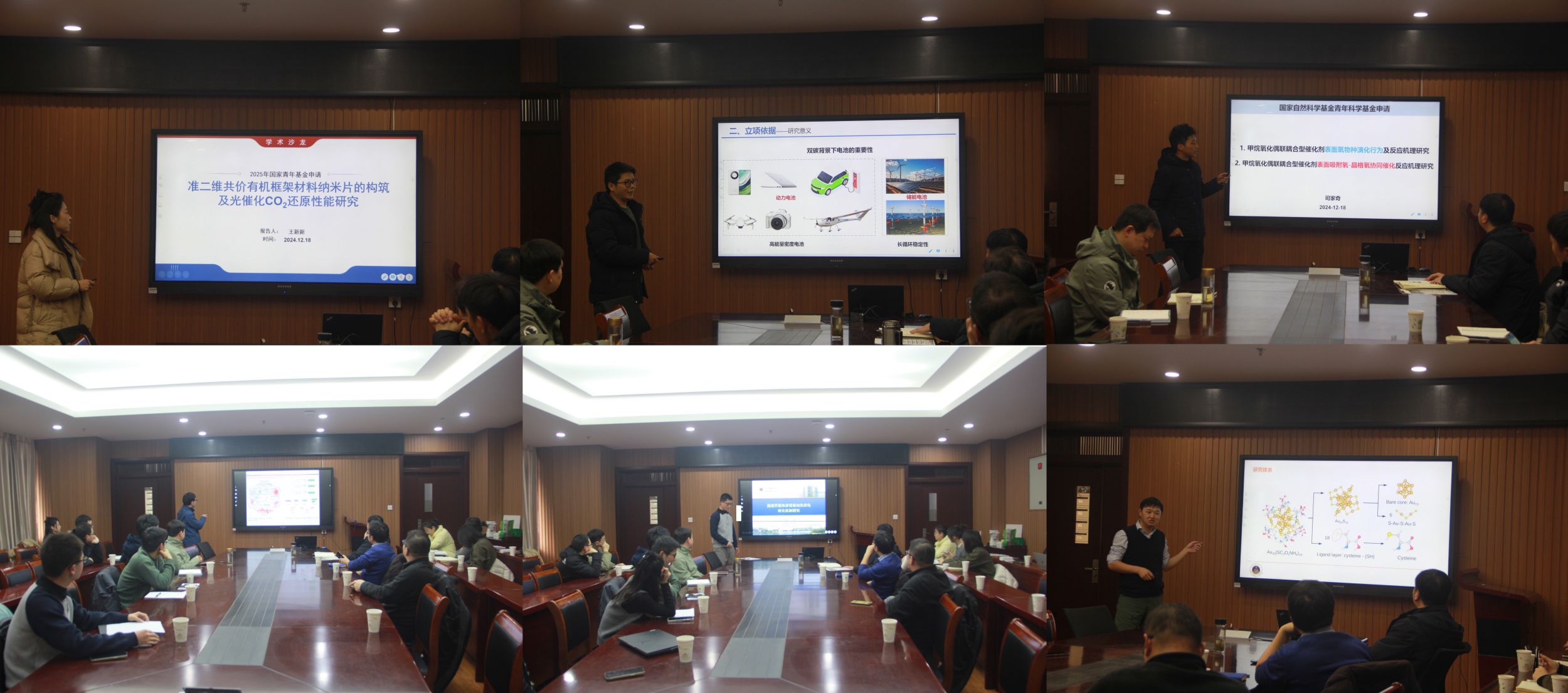王新新、杨西亚、司家奇、姚陈志、王新、方林灿等六位博士分别作了题为“准二维共价有机框架材料纳米片的设计合成及其光催化CO2还原性能研究”、“功能耦合三维共价有机框架的构筑及锂-氯气电池研究”、“耦合型催化剂表面吸附氧-晶格氧协同催化甲烷氧化偶联反应机理研究”、“触发激活型氮杂氟硼荧类高分子荧光探针的合成与生物应用”、“基于机器学习势函数的固液界面处热渗透驱动的热质耦合输运特性的跨尺度模拟”和“应用机器学习加速团簇结构搜索”的报告。本次学术沙龙各位青年博士主要结合即将申报的2025年国家自然科学基金选题展开汇报,报告过程中各位青年博士着重介绍了各自的研究基础、国家自然科学基金的选题思路、研究内容、拟解决问题等。