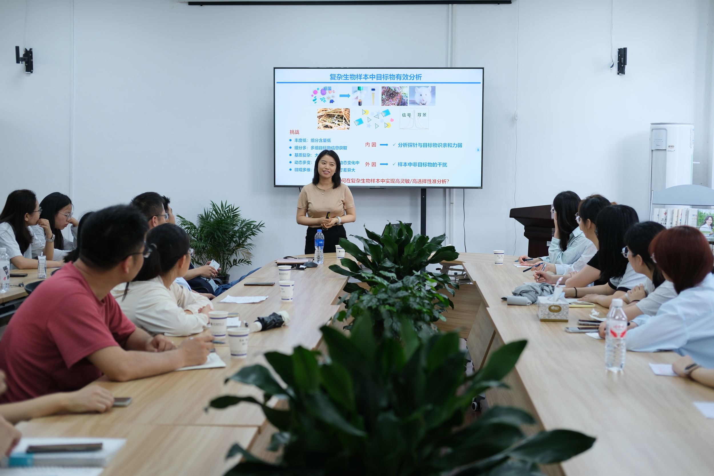宋尔群教授作了题为致病菌的光磁传感分析的学术报告。宋教授首先系统阐述了在复杂生物样品中对目标物进行有效分析所面临的挑战及其成因,指出当前技术在选择性、灵敏度及成像精度方面的局限。随后,宋教授介绍了课题组在该领域所开展的一系列研究工作,围绕酶、ROS、酸性环境等微环境激活机制,构建了多种光/磁传感探针体系,包括:酶激活FRET荧光探针解组装、酶激活CBT-Cys点击AIE探针自组装、酶激活CBT-Cys点击荧光探针解组装活体胞内菌原位成像、微球核酸酶特异激活胞内细菌原位成像、ROS激活MRI ON实胃部幽门杆菌特异成像、酸激活MRI ON实现腹膜中致病菌成像等构建了系列基于微环境激活调谐的光/磁传感探针,实现了活细/活体中致病菌精准灵敏成像分析。在展望未来研究方向时,宋教授提出三点关键发展策略:开发更具特异性/多参数级联激活光磁传感探针以提高准确性;开发具有更高信噪比光磁传感探针以提高灵敏度;探究活体胞内菌精准分析方法及细菌与宿主细胞相互作用示踪方法。会后,宋尔群教授就报告内容与参会师生展开讨论,并回答了师生提出的问题。
