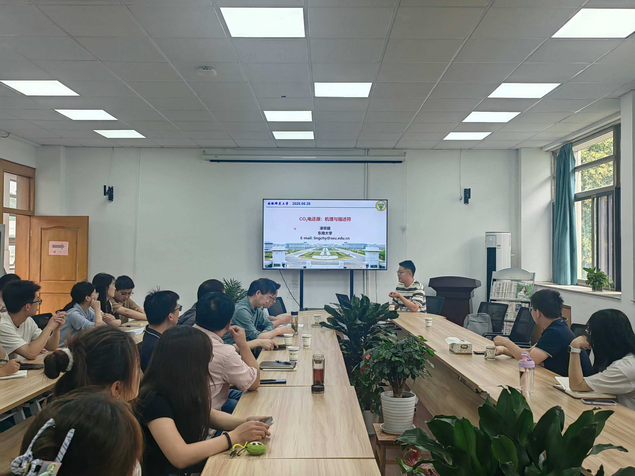 凌崇益教授作了题为“CO2电还原:机理与描述符”的学术报告。凌教授深入解析了二氧化碳还原反应中乙酸产率的CO分压依赖性、pH对CO2 RR和CO RR选择性差异等关键机理谜题,创新提出“CO热氧化诱导乙酸生成”的反应路径模型,并针对传统电催化剂描述符计算复杂、可解释性差的局限,构建了基于几何-电子双效应的单原子合金描述符,实现活性位点电子饱和度与吸附构型的定量关联,该成果成功应用于M-N-C及单原子催化剂设计,近四年连续以封面论文形式发表于《美国化学会志》。会后凌教授与与会师生就描述符普适化拓展及机器学习辅助机理研究等议题展开深入讨论并回答了现场提问。