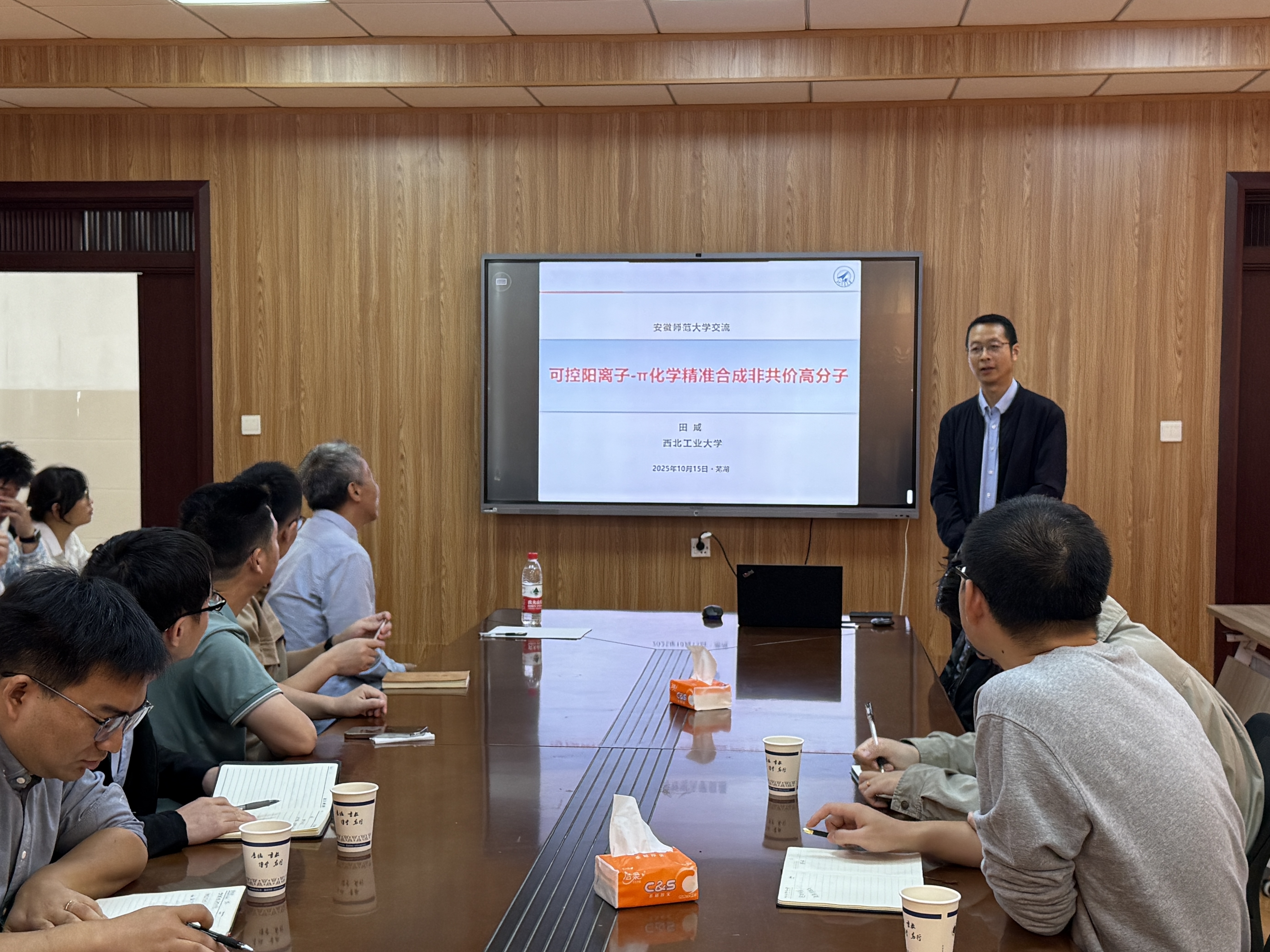 田威教授作了题为“可控阳离子-π化学精准合成非共价高分子”的学术报告。田教授聚焦阳离子-π作用,首先阐释高分子合成的重要性及非共价合成“可用而不可控”的挑战,指出阳离子-π作用具有键合强度高、自适应性强、电荷转移特性等优势,却存在作用方向难控、作用力范围与强度不确定的难点;进而提出建立可控阳离子-π化学新体系的解决策略,通过模块化阳离子-π单体(对)结构设计与阳离子-π导向的可控超分子聚合,实现了阳离子-π非共价高分子的精准构筑与调控,涵盖溶液聚合机制、长程有序的一维至三维固态结构及分级微孔微观结构的构筑;同时介绍了阳离子-π增强的非共价高分子材料在热稳定性、溶剂稳定性上的优异表现,以及其在基于二维异孔杂化负载体系的双模催化平台中的应用。最后总结,建立了可控阳离子-π化学新体系,构筑了不同维度的长程有序超分子聚合物,并实现其在多功能催化等领域的应用。会后,田威教授与参会师生进行了深入交流,并详尽解答了现场提问。