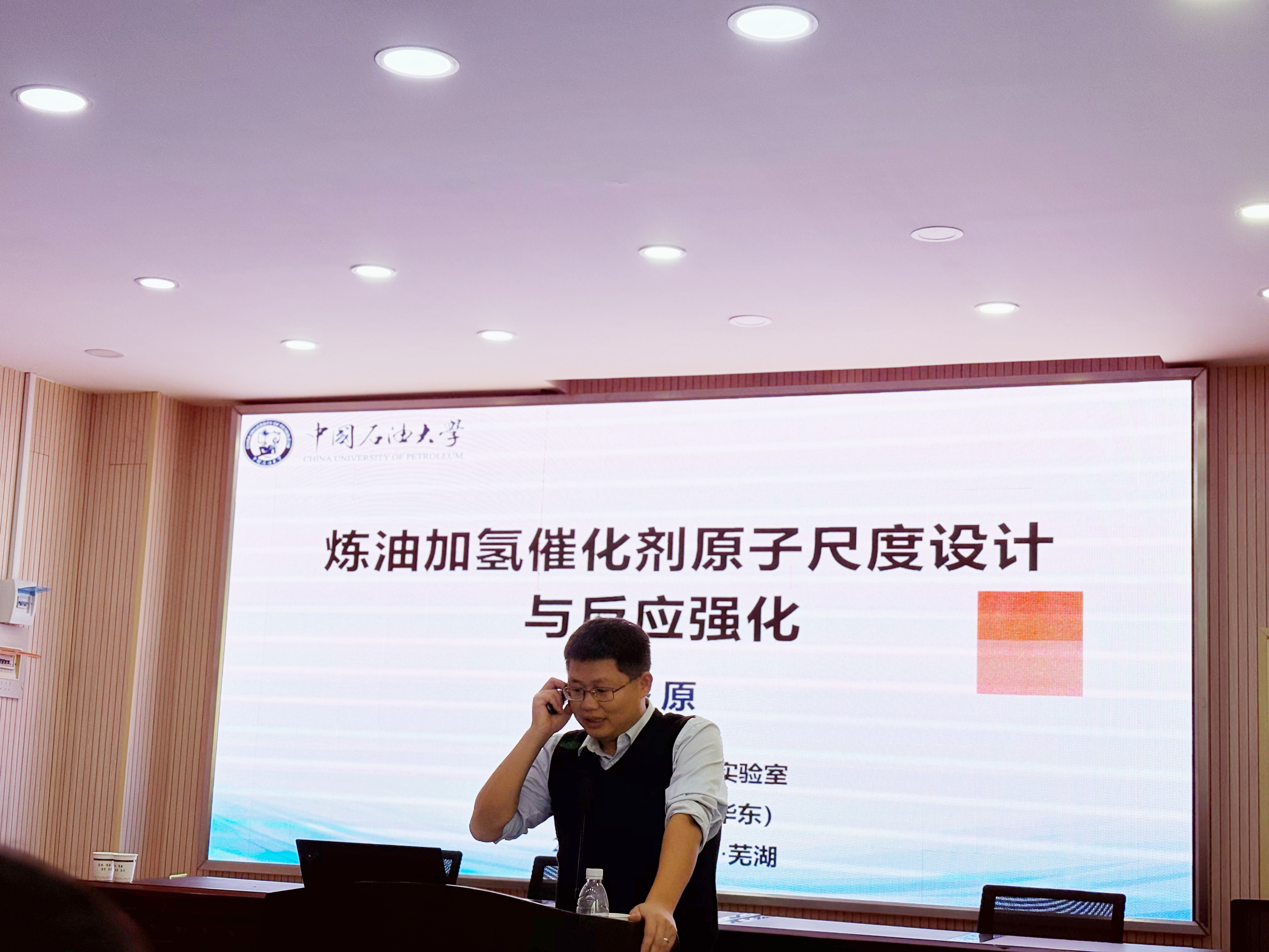 潘原教授作了题为“炼油加氢催化剂原子尺度设计与反应强化”的学术报告。潘教授聚焦劣质重油高效转化和烯烃高值化利用这两大炼化行业关键需求,首先阐释浆态床加氢是劣质重油转化的有效途径,氢甲酰化技术是烯烃高值化的重要路径,指出我国在这两个领域长期受国外催化剂技术垄断,传统催化剂存在易团聚失活、活性不足等性能短板,且炼化行业面临炼油产能过剩、高端化工材料进口依赖的现状;进而提出基于单原子催化的创新解决策略,在重油加氢领域可显著提升加氢效率、强化氢分子活化与传质,在烯烃氢甲酰化领域开发非均相单原子钴催化剂实现“类Rh”活性,并提出Co-Zn双原子位点机制抑制Co浸出,同时提及研究在催化剂性能优化与反应机理探索上的突破,部分技术已成功应用于工业装置;最后总结,研究首次报道了重油加氢与烯烃氢甲酰化领域的系列单/双原子催化剂,阐明了原子尺度下的独特反应机理,学术成果影响广泛。会后,潘原教授与参会师生进行了深入交流,并详尽解答了现场提问。