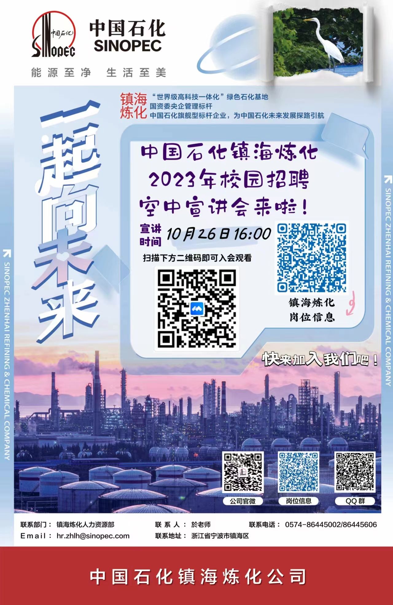 【应聘途径】即日起至2022年11月15日24:00,登录中国石化人才招聘网-“校园招聘”,搜索“镇海炼化”进行应聘。
