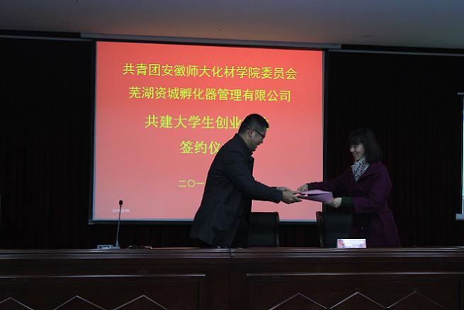 委员会、芜湖资城孵化器管理公司共建大学生创业基地”的签约仪式,仪式后,吕戴君及张钊就此次比赛发表讲话,为大学生提供创业提供了两条宝贵经验:一是创业不要一味的模仿,要有自己的独特想法,二是要大胆创新而不是盲目创新。