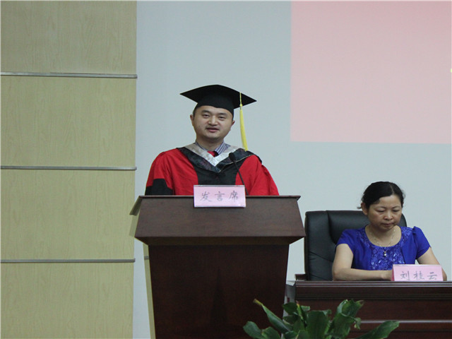 毕业典礼在庄严的国歌声中拉开序幕。学院院长高峰教授代表学院向学有所成的2016届毕业生表达了衷心的祝贺!他希望全体毕业生要学无止境,在今后的人生道路中继续奋斗,用真才实干去铺就实现人生理想的坚实阶梯;要踏实做人,有扬在脸上的自信、长在心底的善良、融进血里的骨气;要爱岗敬业,珍惜、敬重和善待第一个工作机会,积极承担责任、努力实践、为社会贡献自身价值;要享受生活,正确处理生活与工作的关系,孝敬父母、呵护子女,彰显理工科人应有的浪漫情怀。