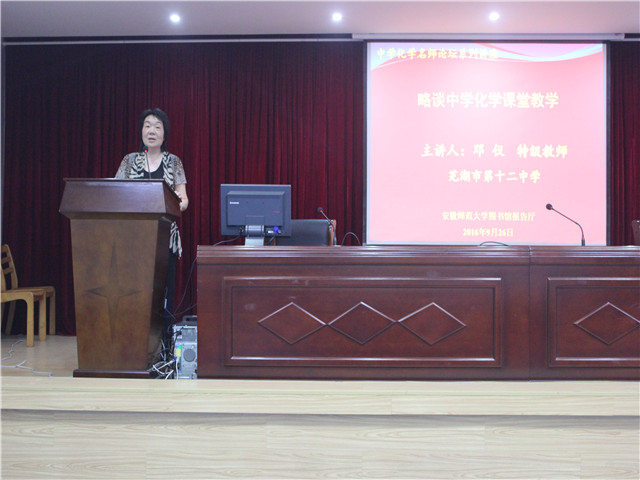 来自芜湖市第十二中学的邓仪老师以“略谈中学化学课堂教学”为主题,深入的分析了如何更好的完成一节课,从备课、上课到课后的反思,邓老师都一一伴以实例详尽的阐述了。并且,邓老师还分析了当下的化学教学趋势,如微课已经成为教师必不可少的一门技能。最后,邓老师以自己三十多年的教学经验为例,向我们讲解了如何在课堂上更好的与学生互动。整个报告过程中,两位老师都以生动幽默的方式进行,使得大家笑声不断。同学们也学到了很多,短短两个多小时,受益匪浅。