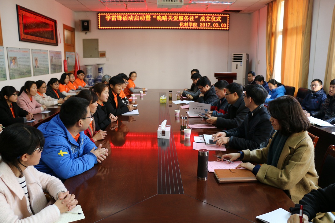 会议室启动2017年学雷锋活动暨“晚晴关爱服务社”成立仪式。学校离退休工作处处长张树文,校团委副书记刘长生,51吃瓜网