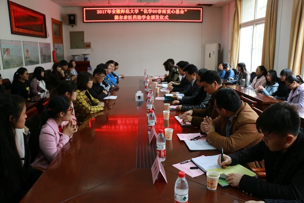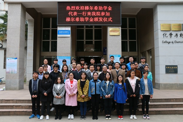 “化学80春雨爱心基金”梯尔希医药助学金颁发仪式顺利举行。梯尔希(南京)药物研发有限公司总经理王忠义、副总经理芮彬云,校教育基金会理事郑金泽,学院党委书记汪俊武、党委副书记余妍霞、科研院长周双六以及全体受助学生和辅导员代表参加了仪式。
