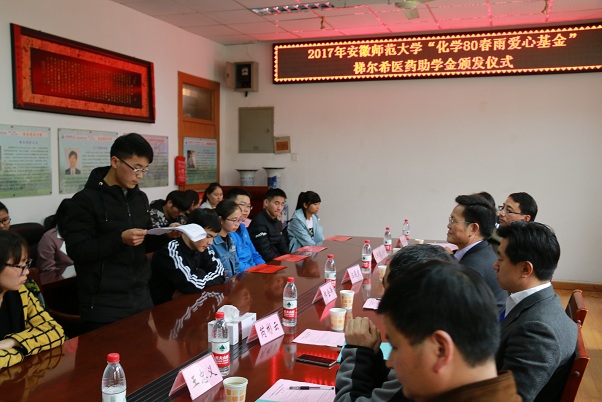 颁发仪式上,郑金泽宣读了梯尔希医药助学金颁发决定,并鼓励全体受助学子勤俭节约、努力学习,力争在品德和学业上取得更大进步。他希望广大同学能够积极进取、求实创新,争做学院优秀学生的典范。芮彬云代表资助人为受助学子颁发了助学金,他鼓励受助学生要自强不息,不断进取。15级材料化学专业董伟同学代表全体受助学生表达了对爱心助学金资助人诚挚的感谢,他表示自己会珍惜来之不易的学习机会,志存高远、自强自立,用过努力赢得一个精彩的大学生活。